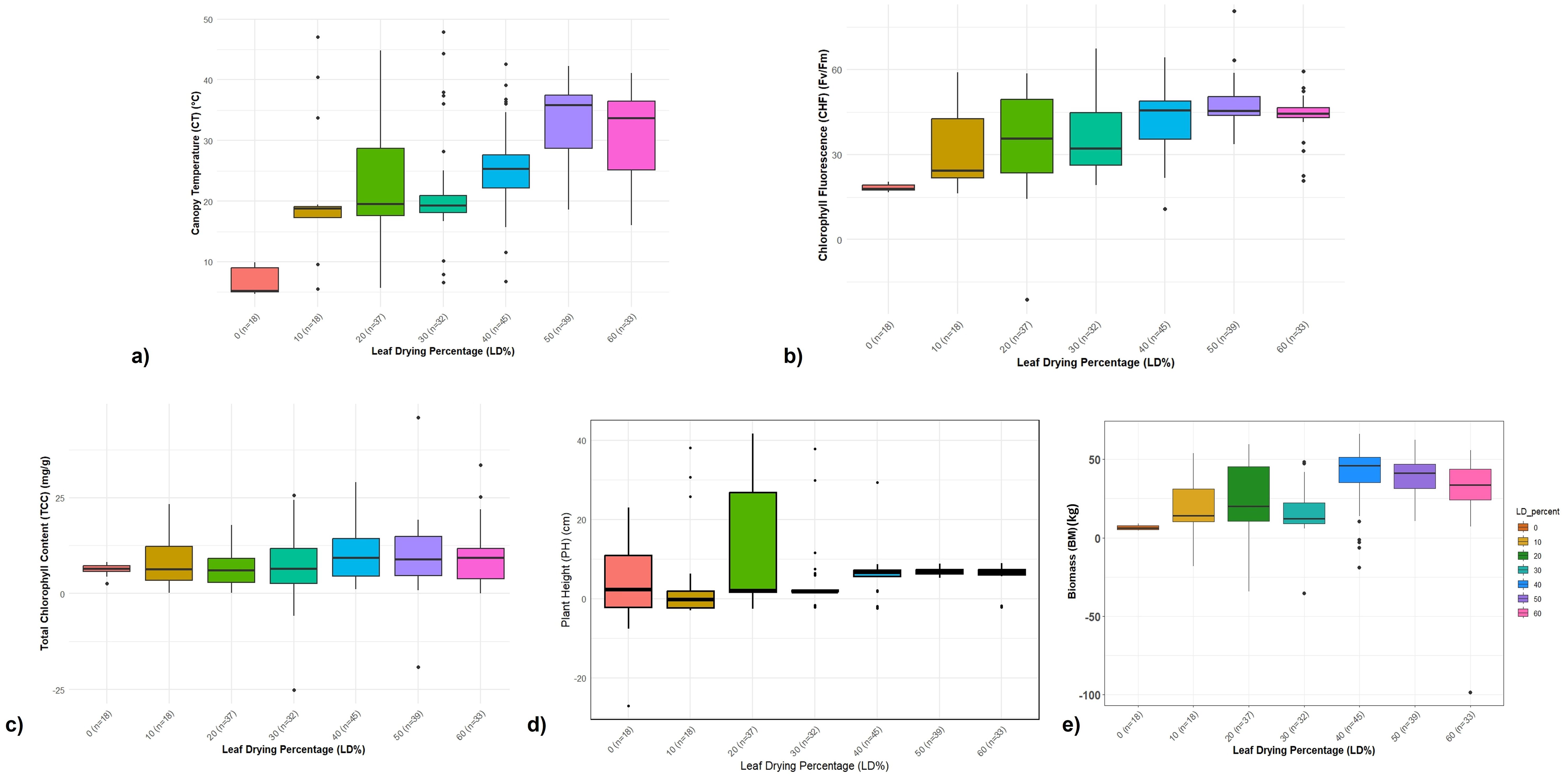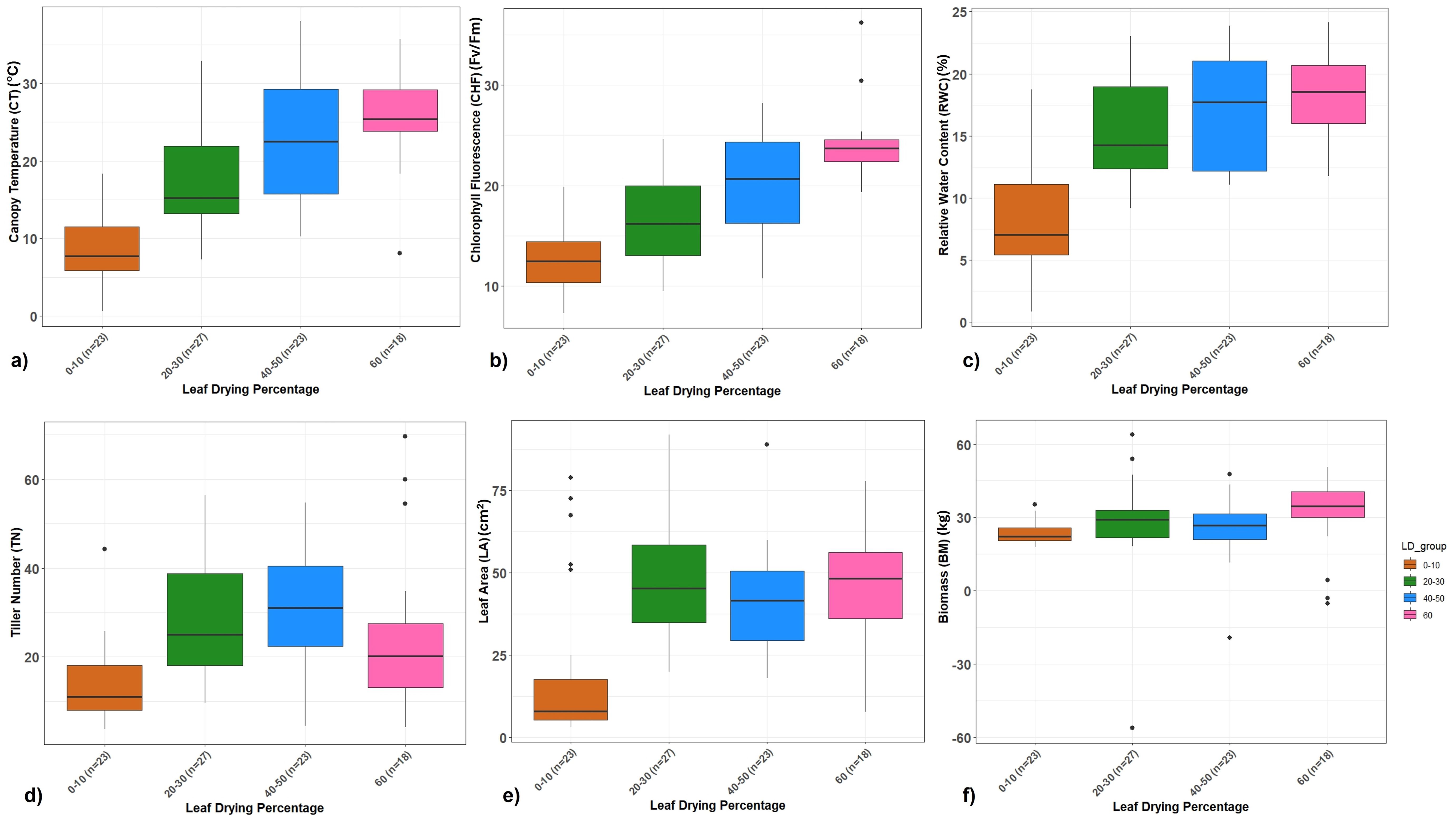 Figure 4. (a–f) Boxplot showing the relationship between different traits vs. leaf drying percentage for the 3-year RBD trial. (a) Percent increase in canopy temperature. (b) Percent reduction in chlorophyll fluorescence (Fv/Fm). (c) Percent reduction in relative water content. (d) Percent reduction in tiller number. (e) Percent reduction in leaf area. (f) Percent reduction in biomass of Erianthus clones under drought stress relative to irrigated control conditions.
