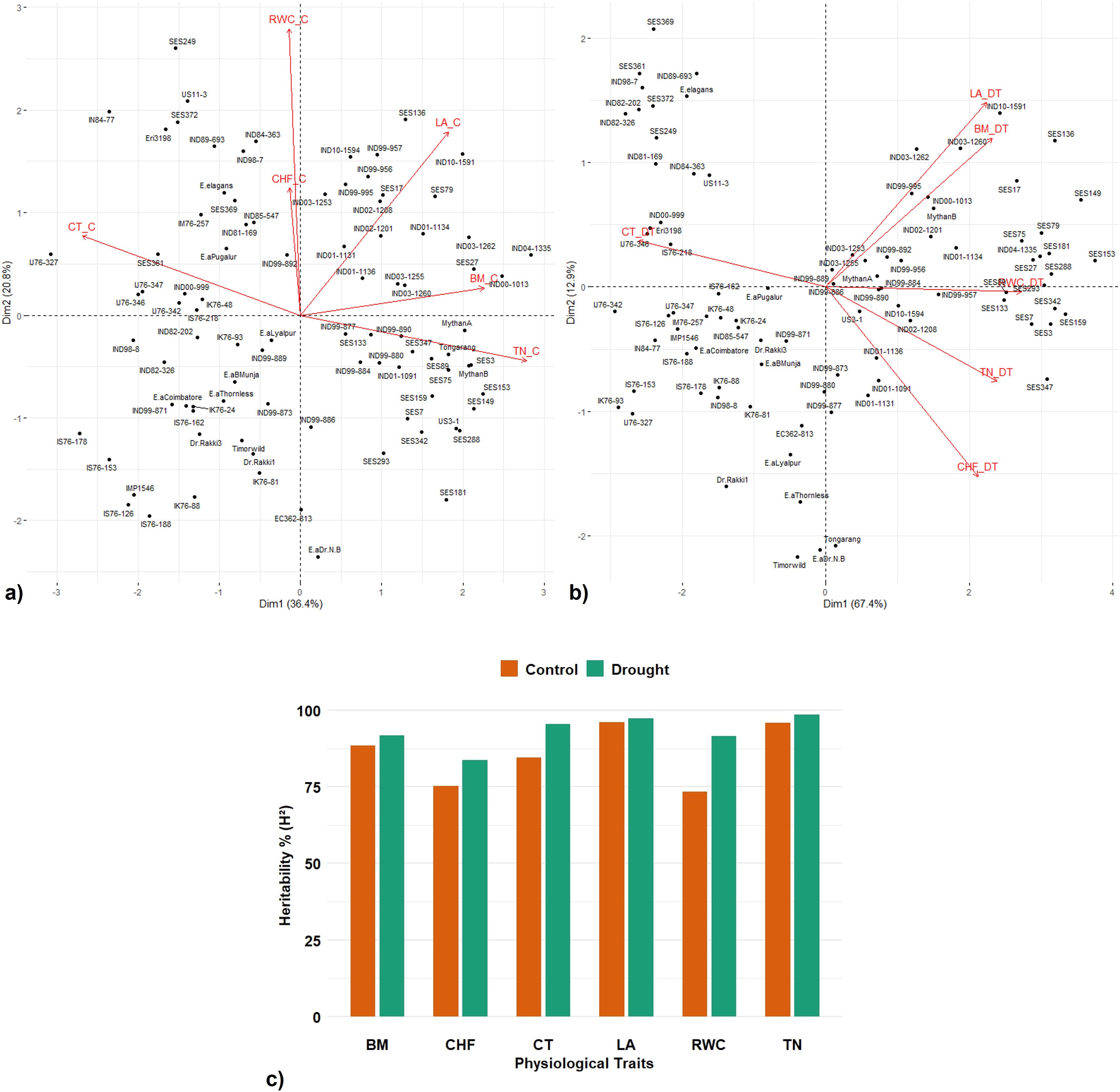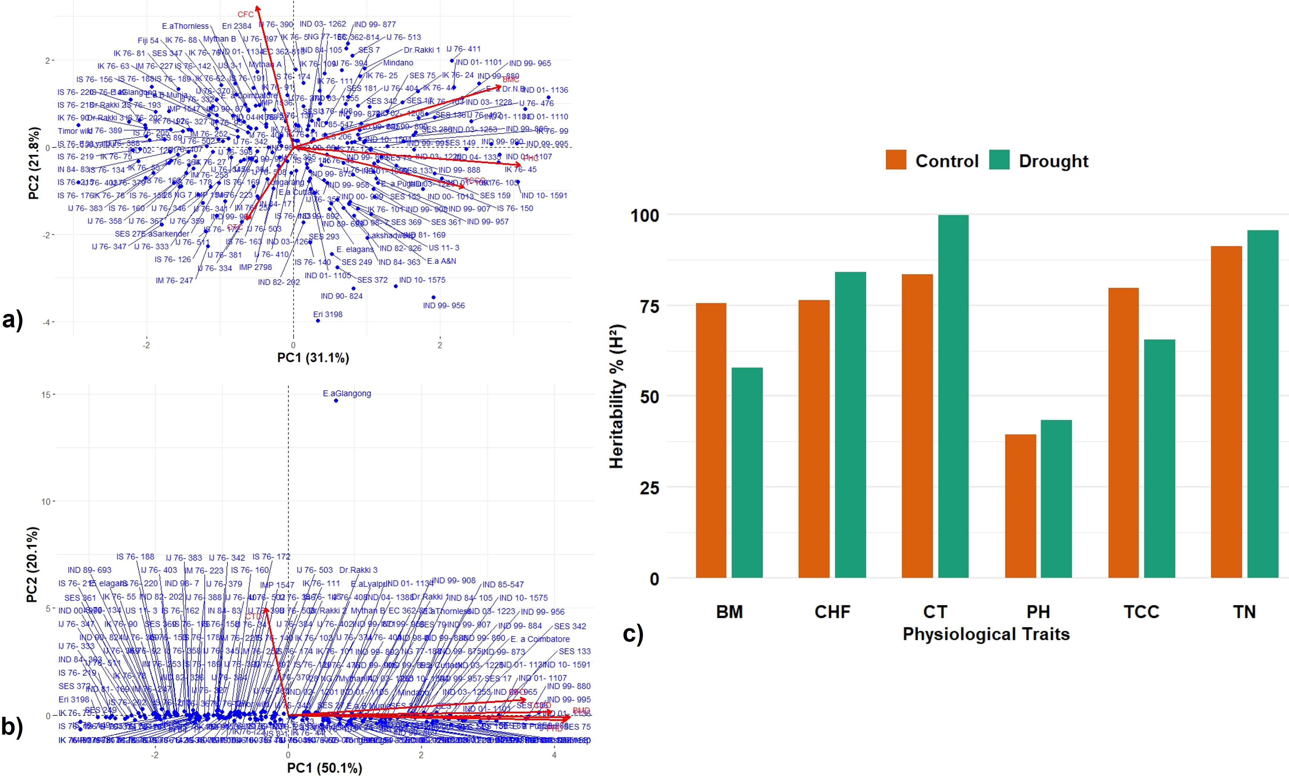 Figure 3. Principal component analysis (PCA) of germplasm accessions and trait relationship and heritability index of physiological traits in Erianthus clones under control and drought conditions. Biplot of the first two principal components of 223 germplasm accessions among the studied traits under control (a) and drought (b). PC1 (Dimension 1), PC2 (Dimension 2). Broad sense heritability % (H2) of different physiological traits under control and drought conditions (c).