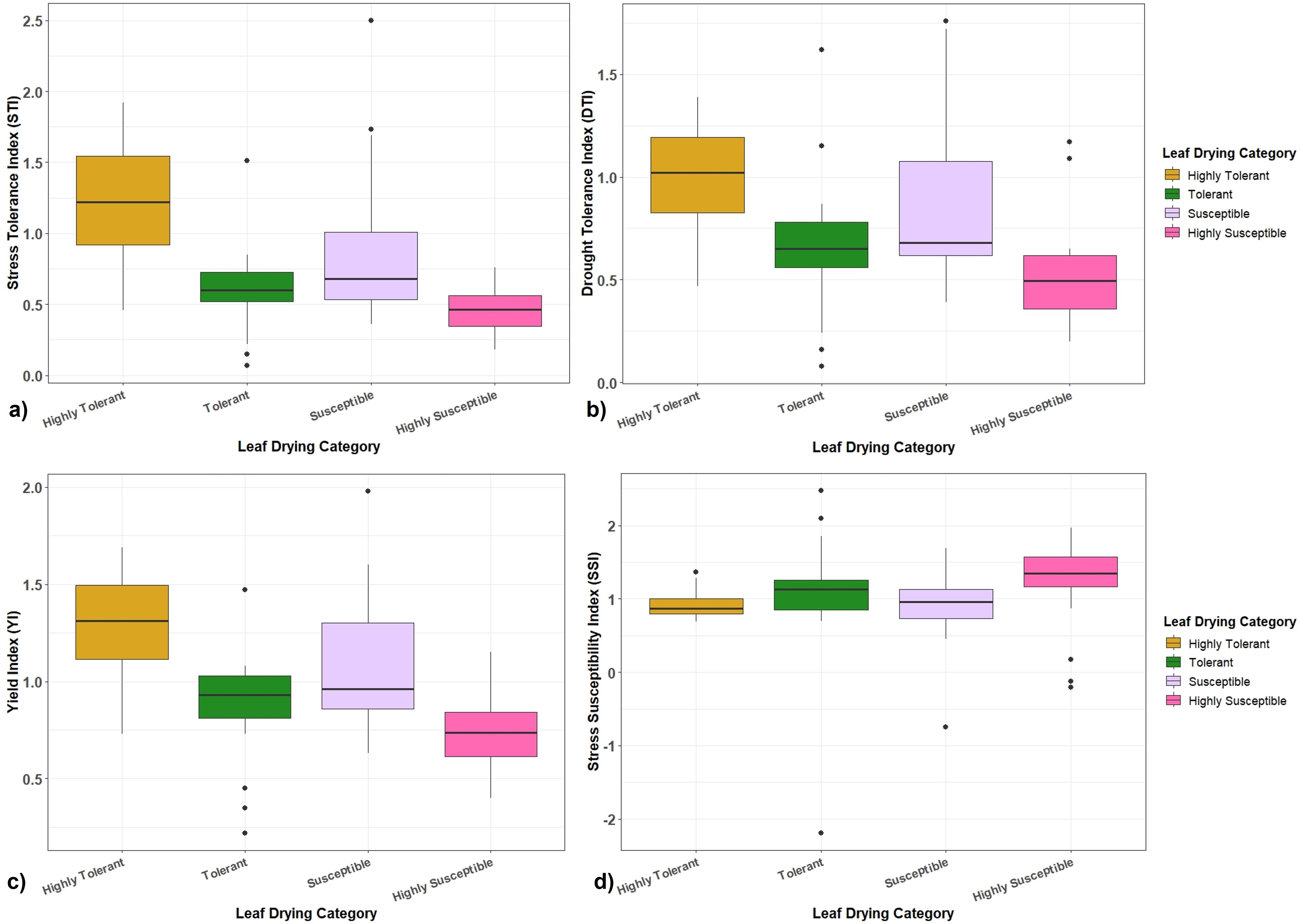 Figure 6. Boxplots showing the relationship between different drought tolerance indices with highly tolerant, tolerant, susceptible, and highly susceptible categories of Erianthus clones. (a) Stress tolerance index (STI). (b) Drought tolerance index (DTI). (c) Yield index (YI). (d) Stress susceptible index (SSI).