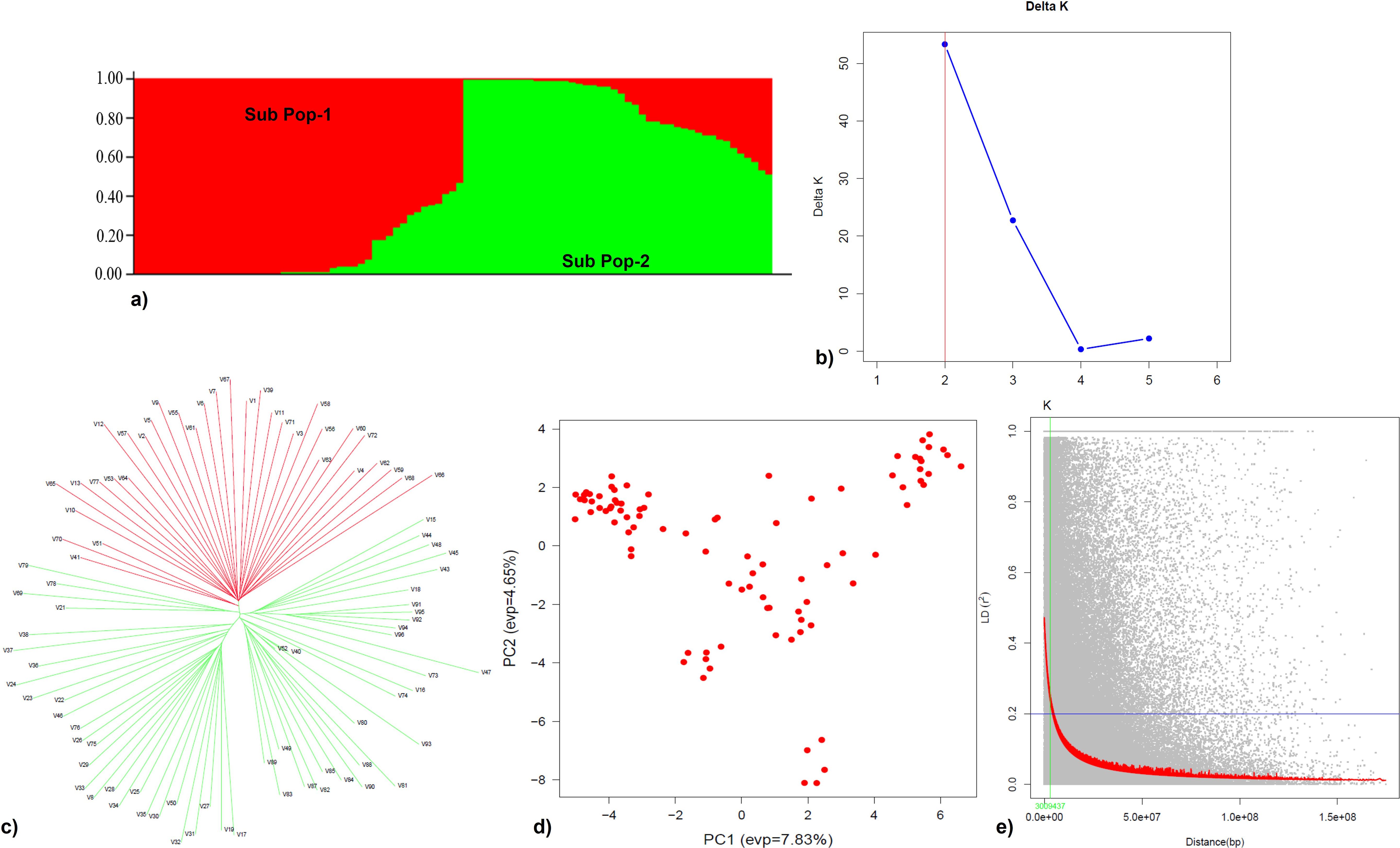 Figure 7. Population structure, principal component, and linkage disequilibrium analyses of the Erianthus drought panel. (a) Bar plot representing two subpopulations (Sub_pop 1 and Sub_pop 2). (b) Delta K plot—Estimation of optimum number for subpopulation (highest peak at K = 2). (c) Neighbor-joining tree of 91 germplasm accessions illustrating the separation of studied germplasm accessions into two main clusters corresponding to structure analysis. (d) Scatter plot of the first two principal components (PC1 and PC2) showing variation present in the accessions. (e) Scatter plot showing the LD decay with physical distance (bp); red color indicates the fitted LD decay.