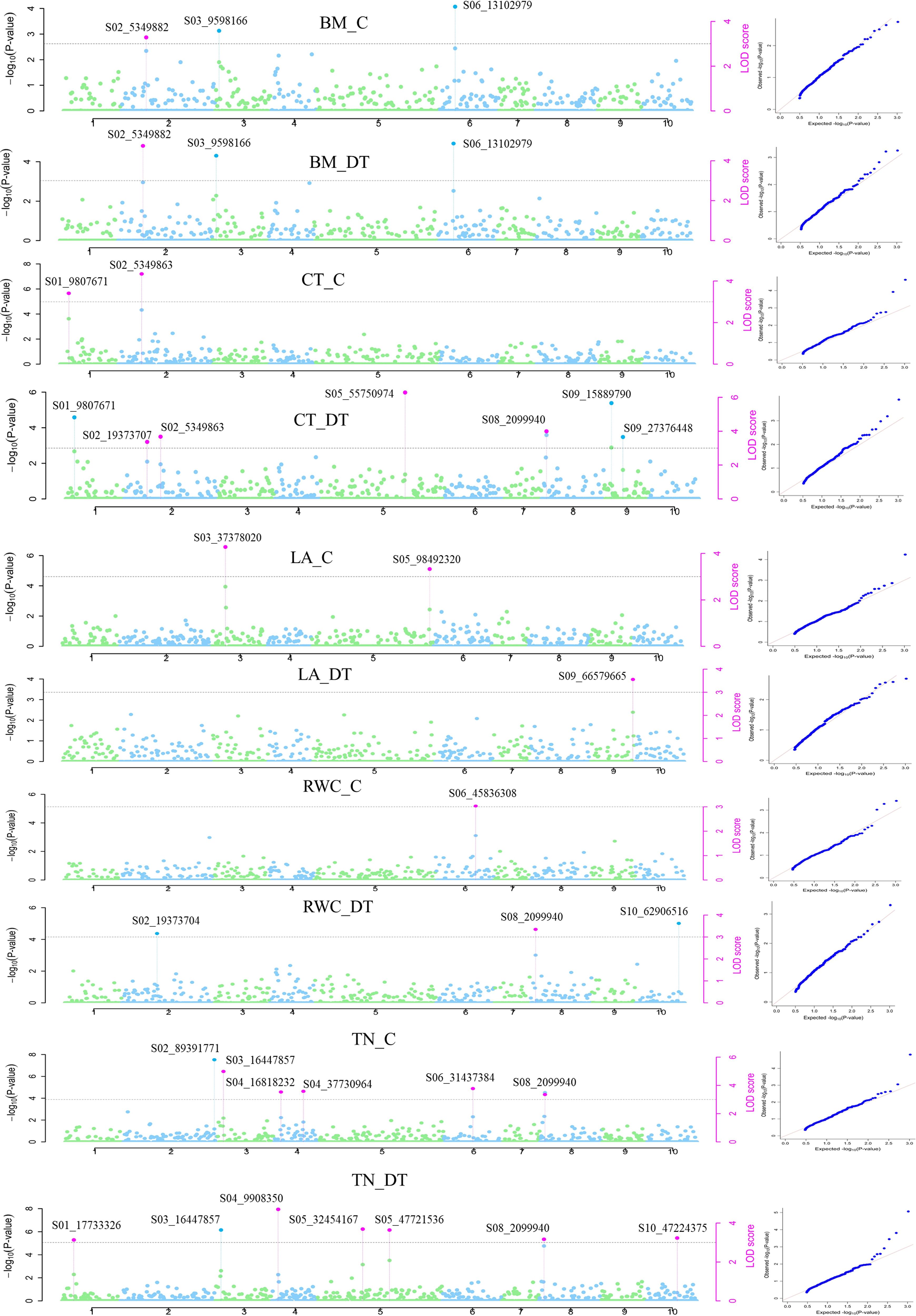 Figure 8. Manhattan plots showing significant QTN (purple color coded) with the corresponding QQ (quantile–quantile) plots representing the distribution of expected and observed p-values for various traits under control and drought conditions. CT_C and CT_ DT—Canopy temperature under control and drought conditions, respectively. LA_C and LA_DT—Leaf area under control and drought conditions, respectively. RWC_C and RWC_DT—Relative water content under control and drought conditions, respectively. TN_C and TN_DT—Tiller number under control and drought conditions, respectively. BM_C and BM_DT—Biomass under control and drought conditions, respectively.