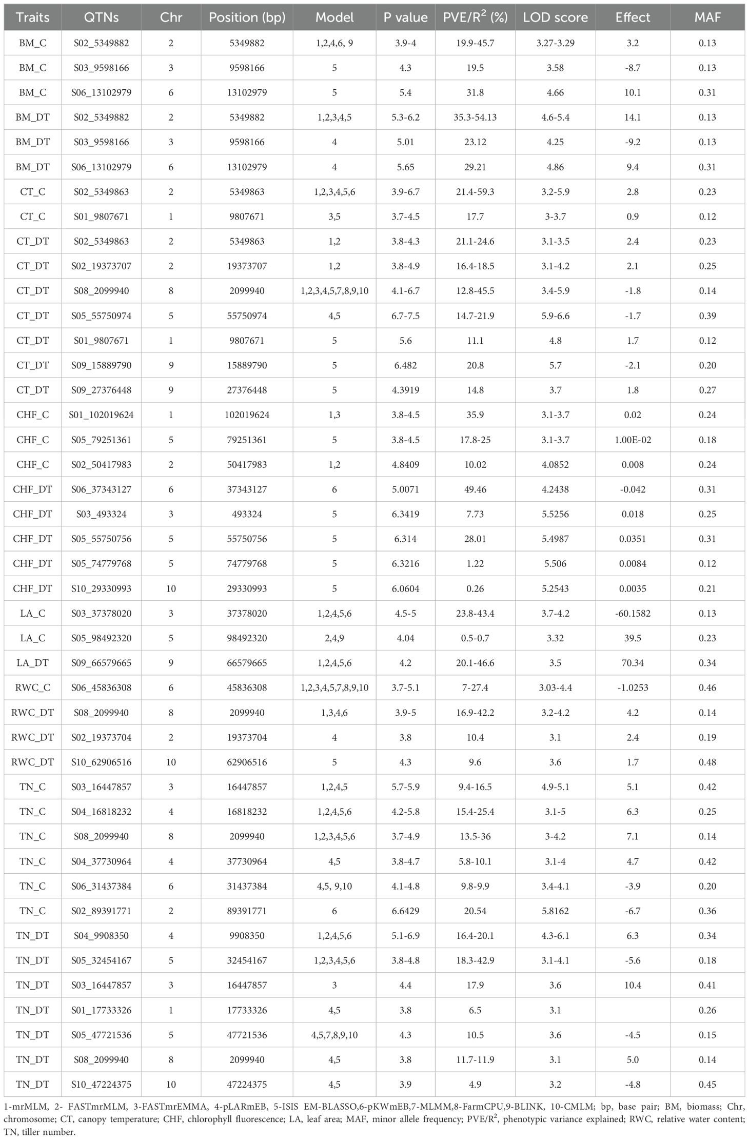 Genome-wide association mapping using six MrMLM models identified 43 QTNs distributed over 10 chromosomes associated with 12 traits under control and drought conditions. Among the six models, ISIS EM-BLASSO and pLARmEB revealed the maximum number of QTNs, i.e., 30 and 22, respectively, whereas FASTmrEMMA detected the lowest number (10) of QTNs. Similarly, 46 QTNs in 10 chromosomal regions were detected using four models in GAPIT. Of these QTNs, 23 were common in at least two models (Table 1; Figure 8). The phenotypic variation explained (PVE or R2) by the QTNs ranged from 0.26% to 59.35%, indicating that traits under both control and drought conditions were controlled by multiple loci with small to moderate effects. The most significant QTN was recorded for biomass under drought conditions (BM_DT) linked to marker S02_5349882 at –Log10 p-value = 6.2 and R2 = 54.1% followed by tiller number under drought (TN_DT) linked to S04_9908350 at –Log10 p-value = 6.9 and R2 = 20.1%. The highest number of QTNs was identified on Chr2 (22) followed by Chr6 (17) (Table 1; Figure 8). Three major QTNs (S02_5349882 identified by five models, S03_16447857 by four models, and S04_9908350 by five models) were identified in Chr2, Chr3, and Chr4, respectively. Trait-wise, QTNs ranged from one each for RWC under control (RWC_C) and LA under drought (LA_DT) conditions to seven QTNs associated with tiller number (TN_DT) as well as canopy temperature (CT_DT) under drought conditions (Table 1). Altogether, 26 QTNs were identified to be associated with different traits under drought conditions whereas 17 QTNs were identified for traits under control conditions. Seven QTNs were common between control and drought conditions, while 9 and 17 QTNs expressed specifically under control and drought conditions, respectively. One QTN (S03_16447857) was associated with both LA (LA_C) and tiller number (TN_C) under control conditions. Moreover, two QTNs (S05_47721536 and S08_2099940, both with FDR p-value = 0.013) identified by MrMLM as well as the GAPIT model were associated with TN_DT. On the other hand, one QTN (S08_2099940) showed association with more than one trait (CT_DT, RWC_DT, and TN_DT) under drought stress (Table 1).