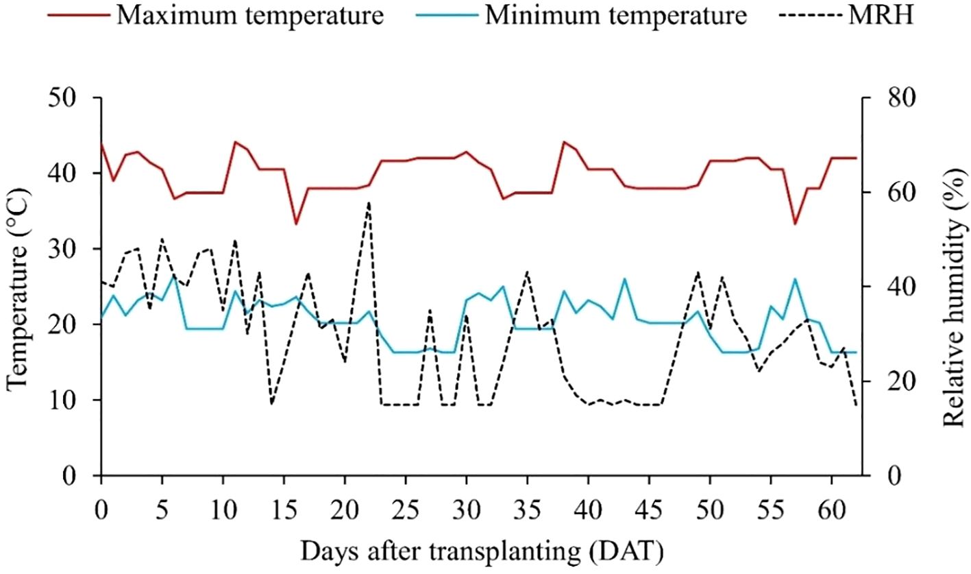 Figure 1. Maximum and minimum temperature, and mean relative humidity (MRH) recorded in the greenhouse during the experimental period.