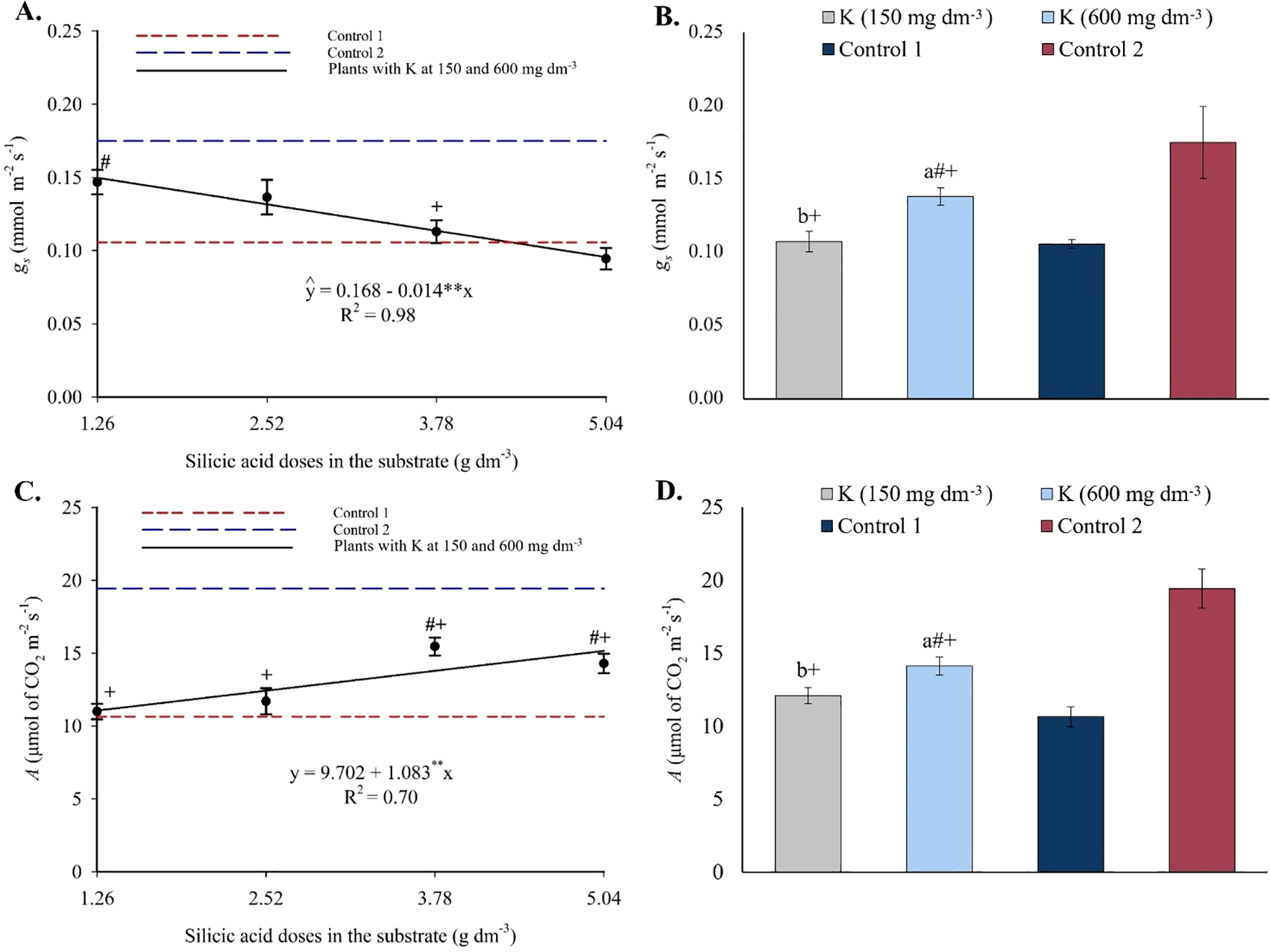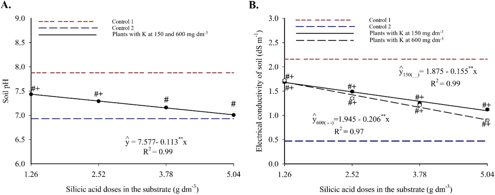 Substrate pH showed a linear decreasing trend with increasing silicic acid doses, regardless of the potassium level (Figure 2A). Values decreased from 7.43 to 7.00 between 1.26 and 5.04 g dm-3 of silicic acid, indicating a gradual acidification of the substrate. Treatments containing silicon differed significantly from both controls: pH values were lower than Control 1 (no silicon, high salinity) and higher than Control 2 (no silicon, low salinity), suggesting a moderating effect of silicon on pH.