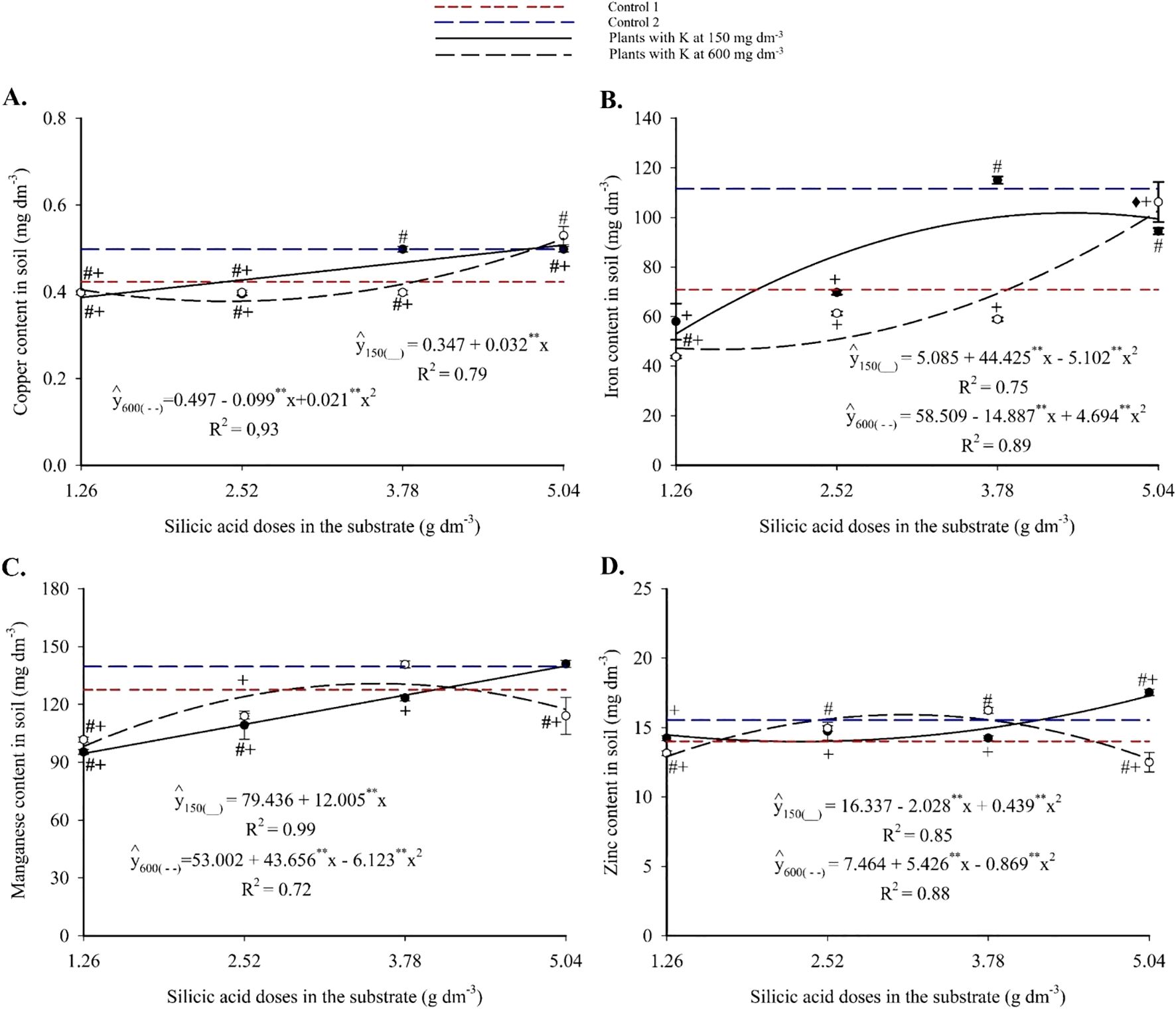 Figure 4. Copper (A), iron (B), manganese (C), and zinc (D) contents in the substrate cultivated with yellow passion fruit subjected to irrigation with saline water and applications of different doses of silicic acid and potassium. **Values significant at 1% probability by the F test. Symbols # and + indicate significant differences compared to Control 1 (irrigated with saline water – EC 4.0 dS m-1) and Control 2 (irrigated with low salinity water – EC 0.5 dS m-1), respectively, according to Dunnett’s test. Error bars represent the standard error of the mean (n = 5).