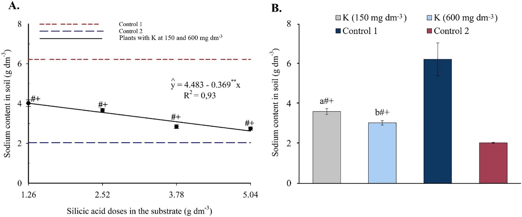 Figure 5. Sodium content in the substrate as a function of silicic acid doses (A) and potassium doses (B). **Values significant at 1% probability by the F test. Symbols # and + indicate significant differences compared to Control 1 (irrigated with saline water – EC 4.0 dS m-1) and Control 2 (irrigated with low salinity water – EC 0.5 dS m-1), respectively, according to Dunnett’s test. Error bars represent the standard error of the mean (n = 10).
