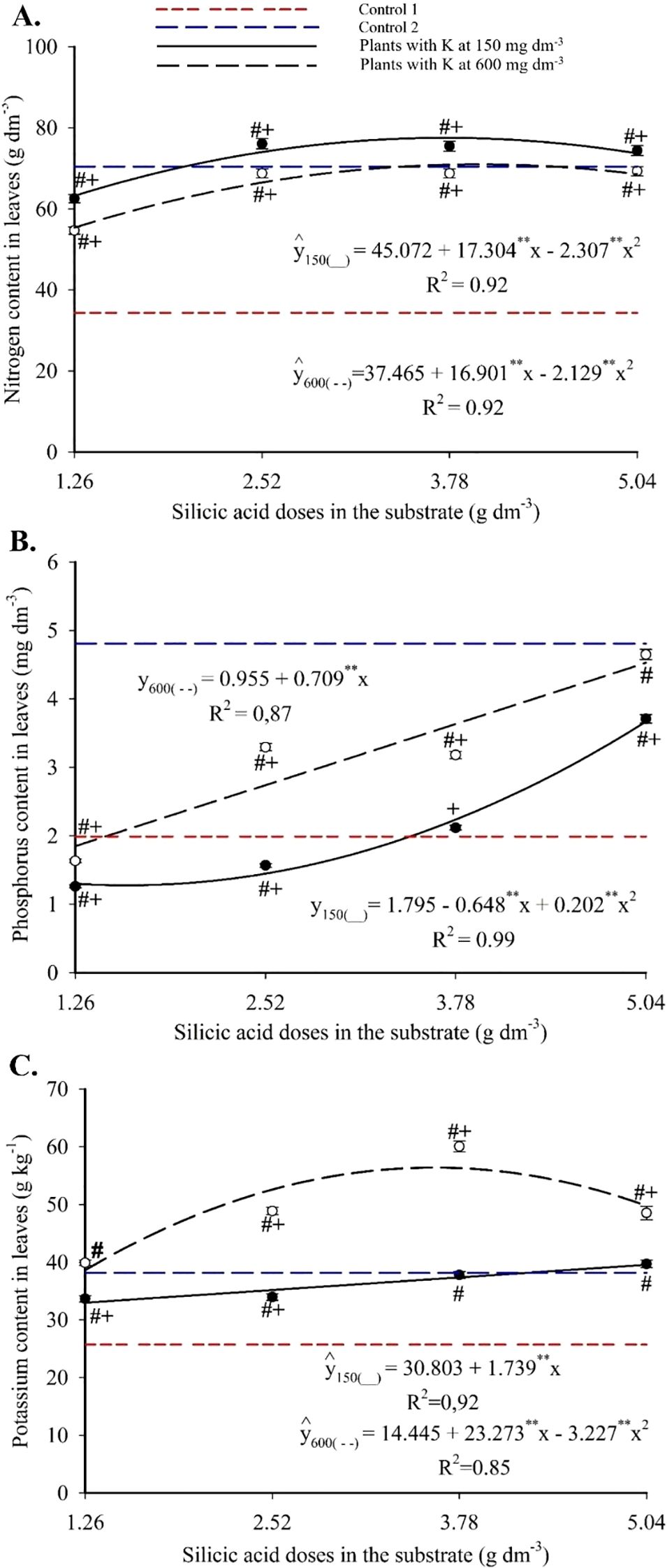 Foliar nitrogen content followed a quadratic response to silicon doses. The combinations of 3.75 g dm-3 of Si with 150 mg dm-3 of K, and 3.97 g dm-3 of Si with 600 mg dm-3 of K resulted in the highest N concentrations, 77.52 and 71.01 g kg-1, respectively (Figure 6A). These values exceeded those of Control 1 in all treatments and were either superior or statistically equivalent to Control 2, except at the lowest Si dose.