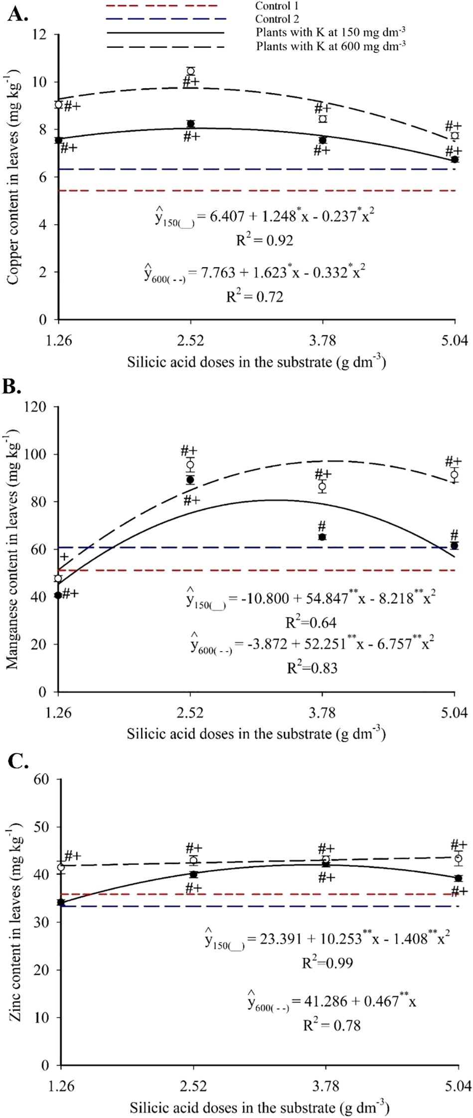 Copper showed a quadratic response to Si, with maxima of 5.42 mg kg-1 (2.63 g dm-3 Si + 150 mg dm-3 K) and 6.33 mg kg-1 (2.44 g dm-3 Si + 600 mg dm-3 K) (Figure 8A). These peak values exceeded those of both controls. Foliar manganese followed a quadratic pattern (Figure 8B), with maximum of 80.71 mg kg-1 (3.34 g dm-3 Si + 150 mg dm-3 K) and 97.14 mg kg-1 (3.87 g dm-3 Si + 600 mg dm-3 K). Most treatments yielded higher values than the controls. Zinc also exhibited a quadratic response, with peak values of 42.06 mg kg-1 (3.64 g dm-3 Si + 150 mg dm-3 K) and 43.64 mg kg-1 (5.04 g dm-3 Si + 600 mg dm-3 K), with nearly all treatments exceeding the control values (Figure 8C).