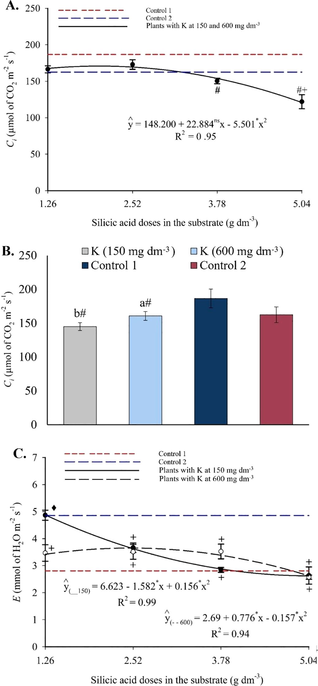 Intercellular CO2 concentration followed a quadratic trend in response to silicon, with reductions at higher doses (Figure 14A). Treatments with silicon showed lower Ci values than both controls. Potassium application also contributed to reductions in Ci compared to control 1 (Figure 14B). The transpiration rate was influenced by the silicon × potassium interaction and followed a quadratic pattern (Figure 14C). At 150 mg dm-3 of potassium, E was highest (4.88 μmol CO2 m-2 s-1) at the lowest silicon dose and lowest (2.61 μmol CO2 m-2 s-1) at the highest. At 600 mg dm-3 of potassium, the maximum E (3.65 μmol CO2 m-2 s-1) occurred at 2.47 g dm-3 of silicon, decreasing to 2.61 μmol CO2 m-2 s-1 at the highest Si dose.