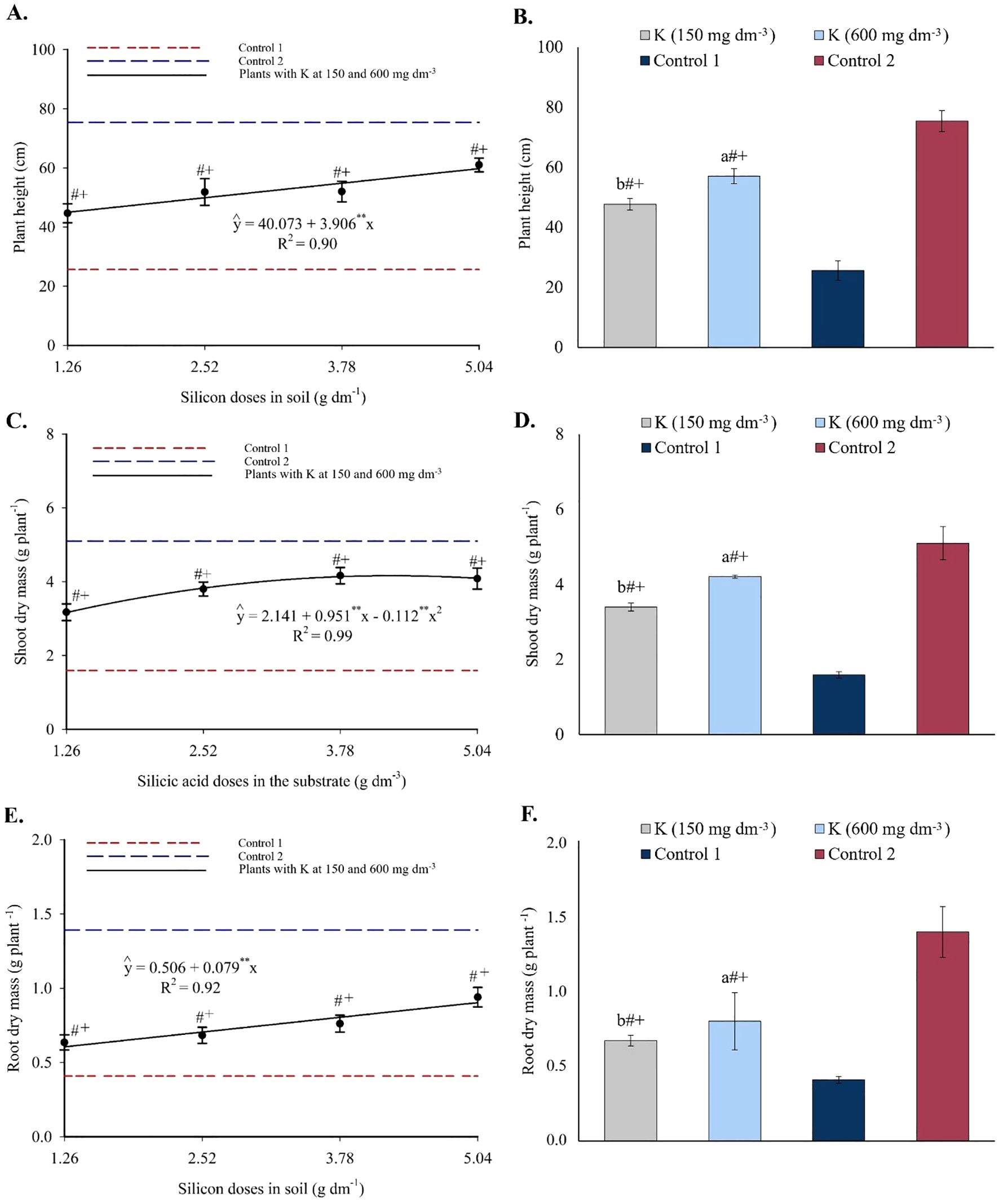 Figure 16. Plant height (A, B), shoot dry mass (C, D), and root dry mass (E, F) of passion fruit seedlings as a function of silicic acid doses and potassium doses. **Values significant at 1% probability by the F test. Symbols # and + indicate significant differences compared to Control 1 (irrigated with saline water – EC 4.0 dS m-1) and Control 2 (irrigated with low salinity water – EC 0.5 dS m-1), respectively, according to Dunnett’s test. Error bars represent the standard error of the mean (n = 10).