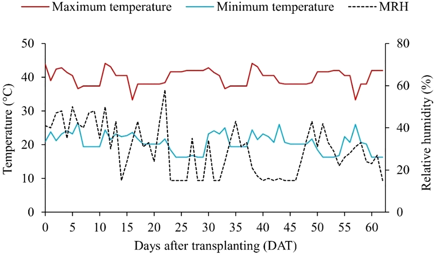 The maximum and minimum temperatures, as well as the mean relative humidity recorded during the experimental period, are shown in Figure 1.