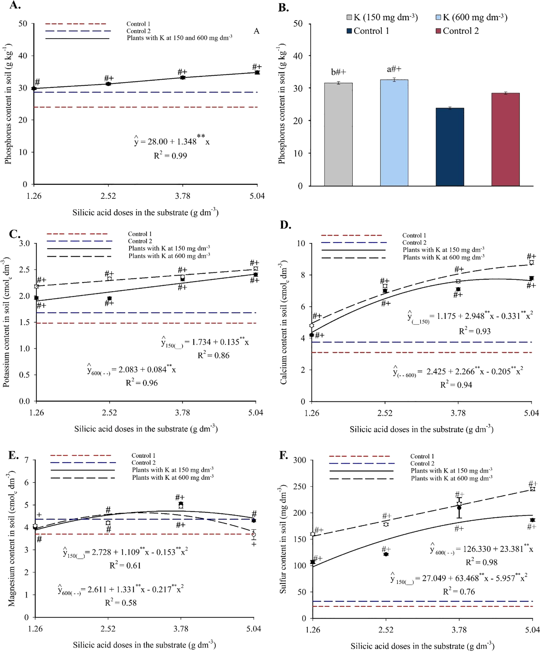 Phosphorus (A, B), potassium (C), calcium (D), magnesium (E), and sulfur (E) contents in the substrate cultivated with yellow passion fruit subjected to irrigation with saline water and applications of different doses of silicic acid and potassium. **Values significant at 1% probability by the F test. Symbols # and + indicate significant differences compared to Control 1 (irrigated with saline water – EC 4.0 dS m-1) and Control 2 (irrigated with low salinity water – EC 0.5 dS m-1), respectively, according to Dunnett’s test. Error bars represent the standard error of the mean [(A, C–F) n = 5; (B) n = 10].