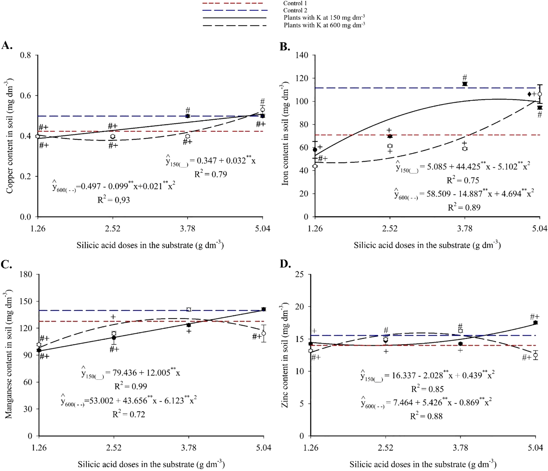 Copper (A), iron (B), manganese (C), and zinc (D) contents in the substrate cultivated with yellow passion fruit subjected to irrigation with saline water and applications of different doses of silicic acid and potassium. **Values significant at 1% probability by the F test. Symbols # and + indicate significant differences compared to Control 1 (irrigated with saline water – EC 4.0 dS m-1) and Control 2 (irrigated with low salinity water – EC 0.5 dS m-1), respectively, according to Dunnett’s test. Error bars represent the standard error of the mean (n = 5).