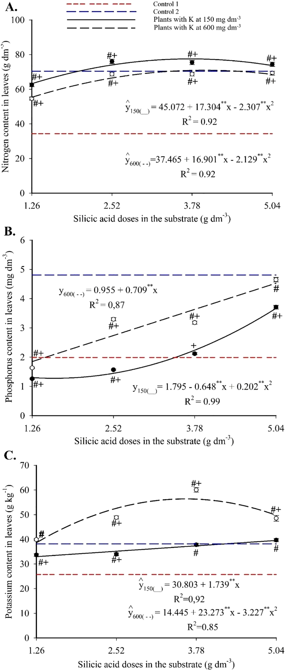 Nitrogen (A), phosphorus (B) and potassium (C) contents in the leaves of passion fruit subjected to irrigation with saline water and applications of different doses of silicic acid and potassium. **Values significant at 1% probability by the F test. Symbols # and + indicate significant differences compared to Control 1 (irrigated with saline water – EC 4.0 dS m-1) and Control 2 (irrigated with low salinity water – EC 0.5 dS m-1), respectively, according to Dunnett’s test. Error bars represent the standard error of the mean (n = 5).