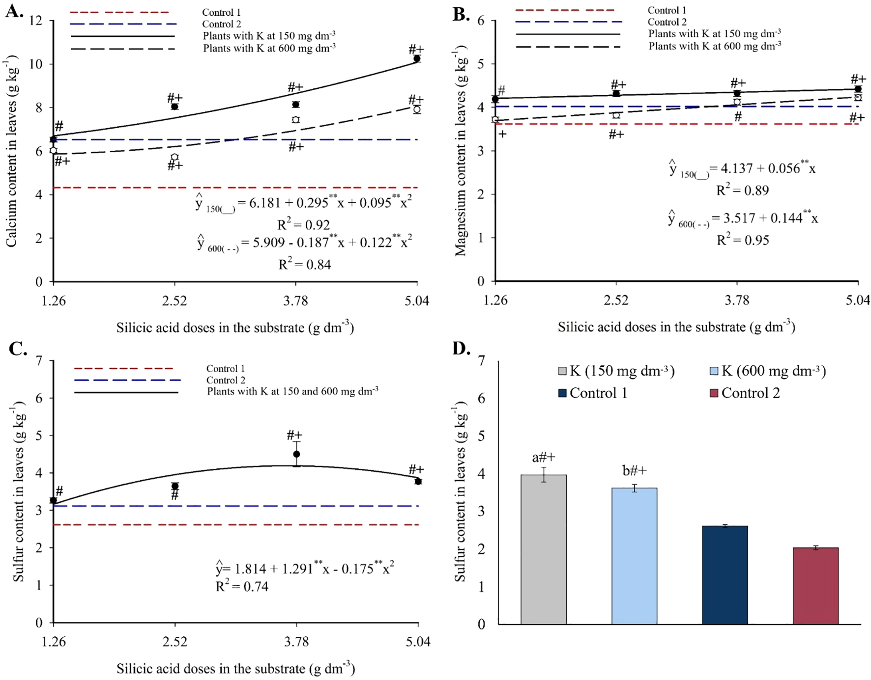 Calcium (A), magnesium (B), and sulfur (C, D) contents in the leaves of passion fruit subjected to irrigation with saline water and applications of different doses of silicic acid and potassium. **Values significant at 1% probability by the F test. Symbols # and + indicate significant differences compared to Control 1 (irrigated with saline water – EC 4.0 dS m-1) and Control 2 (irrigated with low salinity water – EC 0.5 dS m-1), respectively, according to Dunnett’s test. Error bars represent the standard error of the mean [(A, B) n = 5; (C, D) n = 10].