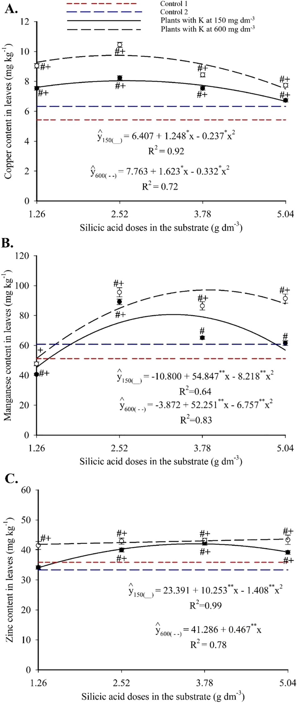 Copper (A), manganese (B), and zinc (C) contents in the leaves of passion fruit subjected to irrigation with saline water and applications of different doses of silicic acid and potassium. **Values significant at 1% probability by the F test. Symbols # and + indicate significant differences compared to Control 1 (irrigated with saline water – EC 4.0 dS m-1) and Control 2 (irrigated with low salinity water – EC 0.5 dS m-1), respectively, according to Dunnett’s test. Error bars represent the standard error of the mean (n = 5).
