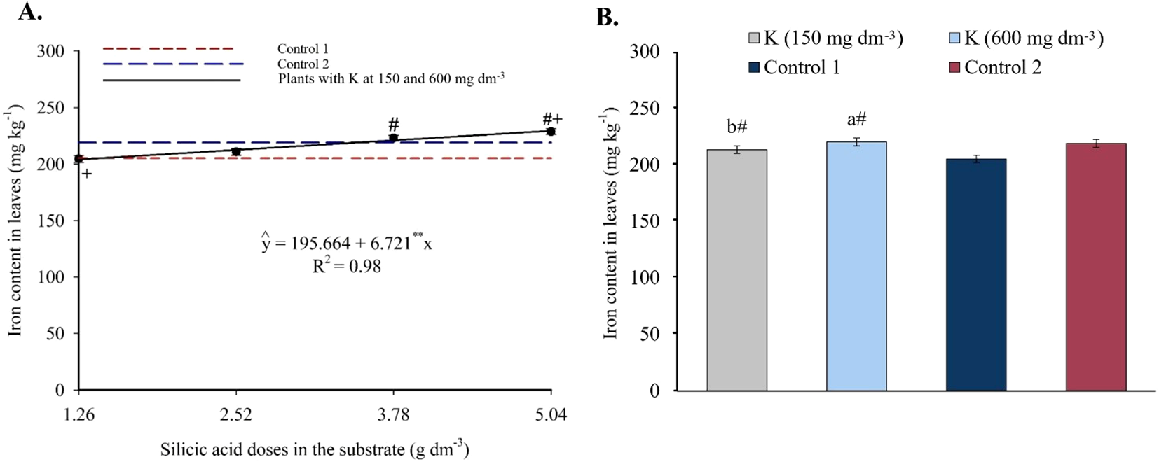 Iron content in the leaves of passion fruit as a function of silicic acid doses (A) and potassium doses (B). **Values significant at 1% probability by the F test. Symbols # and + indicate significant differences compared to Control 1 (irrigated with saline water – EC 4.0 dS m-1) and Control 2 (irrigated with low salinity water – EC 0.5 dS m-1), respectively, according to Dunnett’s test. Error bars represent the standard error of the mean (n = 10).