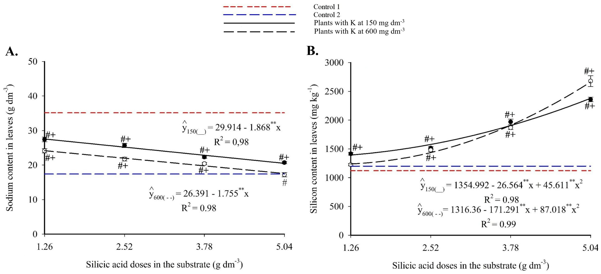 Sodium content in the substrate as a function of silicic acid doses (A) and potassium doses (B). **Values significant at 1% probability by the F test. Symbols # and + indicate significant differences compared to Control 1 (irrigated with saline water – EC 4.0 dS m-1) and Control 2 (irrigated with low salinity water – EC 0.5 dS m-1), respectively, according to Dunnett’s test. Error bars represent the standard error of the mean (n = 10).