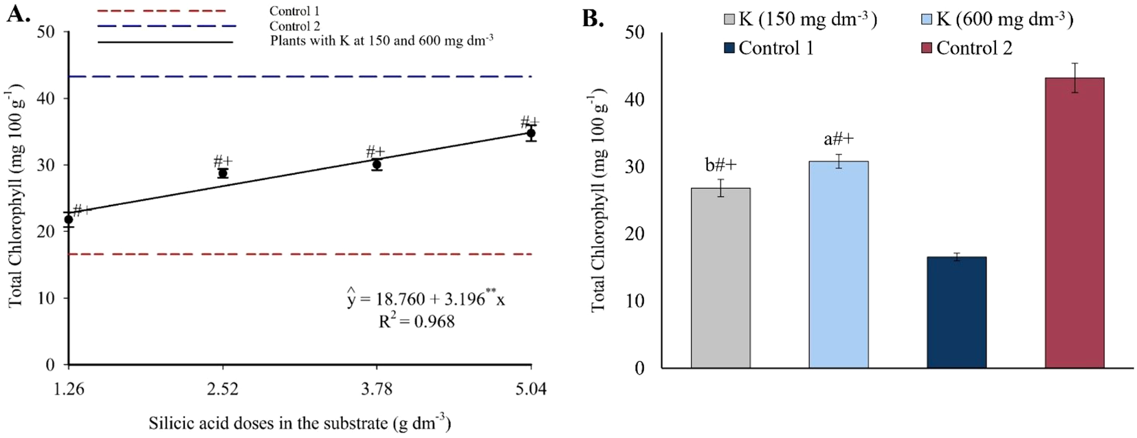 Total chlorophyll increased with higher Si doses (Figure 11A). Values ranged from 22.79 to 34.87 mg 100 g-1 across the Si range of 1.26 to 5.04 g dm-3. In potassium treatments, total chlorophyll levels were higher than in Control 1 and lower than in Control 2, with higher values observed under 600 mg dm-3 of K (Figure 11B).