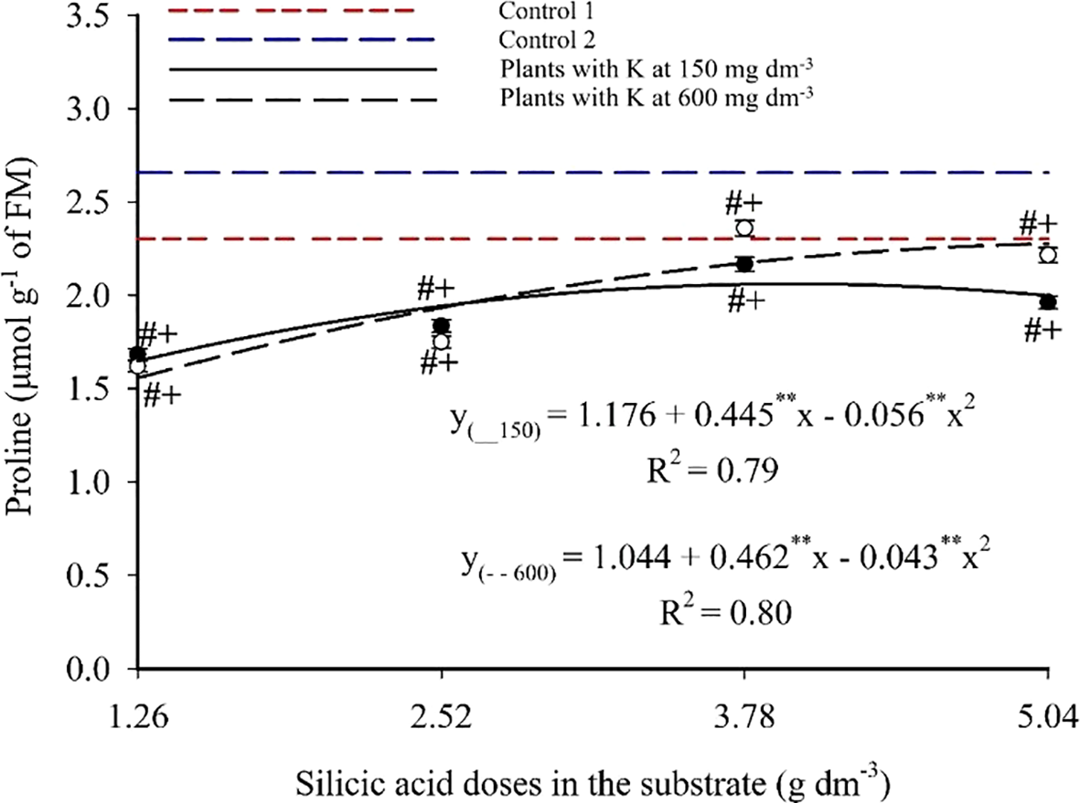 Proline content in the leaves of passion fruit subjected to irrigation with saline water and applications of different doses of silicic acid and potassium. **Values significant at 1% probability by the F test. Symbols # and + indicate significant differences compared to Control 1 (irrigated with saline water – EC 4.0 dS m-1) and Control 2 (irrigated with low salinity water – EC 0.5 dS m-1), respectively, according to Dunnett’s test. Error bars represent the standard error of the mean (n = 5).