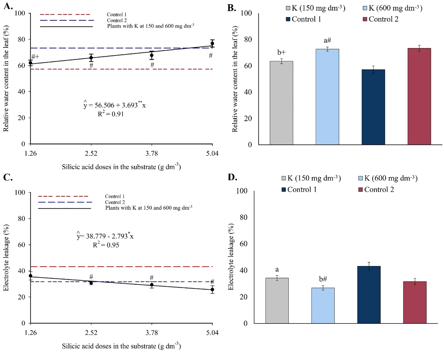 Analysis of variance (see Supplementary Material) revealed a significant interaction (p ≤ 0.05) between silicon and potassium on foliar proline content. Individually, silicon and potassium had significant effects on total chlorophyll concentration. Statistically significant differences were also observed between the treatments and the controls for all these variables.