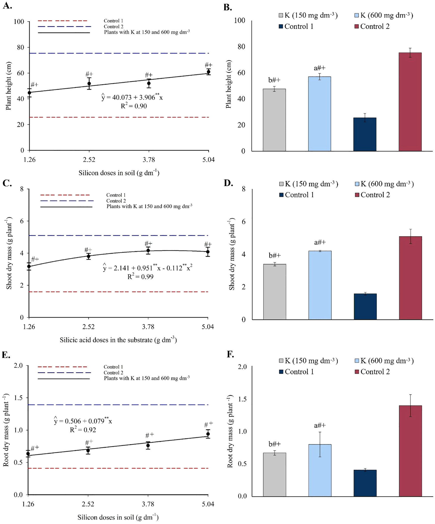 Potassium content increased linearly with silicon across both potassium levels (Figure 3C), ranging from 1.87 to 2.41 g kg-1 at 150 mg dm-3 of K, and from 2.09 to 2.51 g kg-1 at 600 mg dm-3 of K. Silicon addition enhanced K availability regardless of potassium level, and all treatments were statistically superior to the controls.
