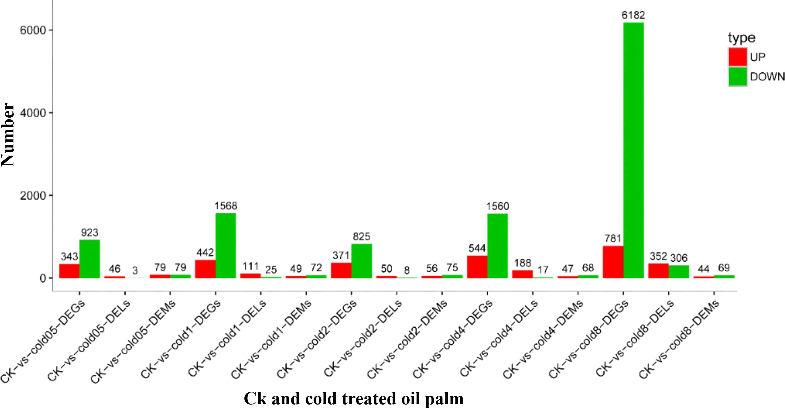 Figure 3. Number of DEGs, DEMs and DELs identified in CK and cold treated oil palm.