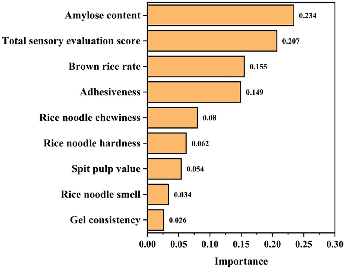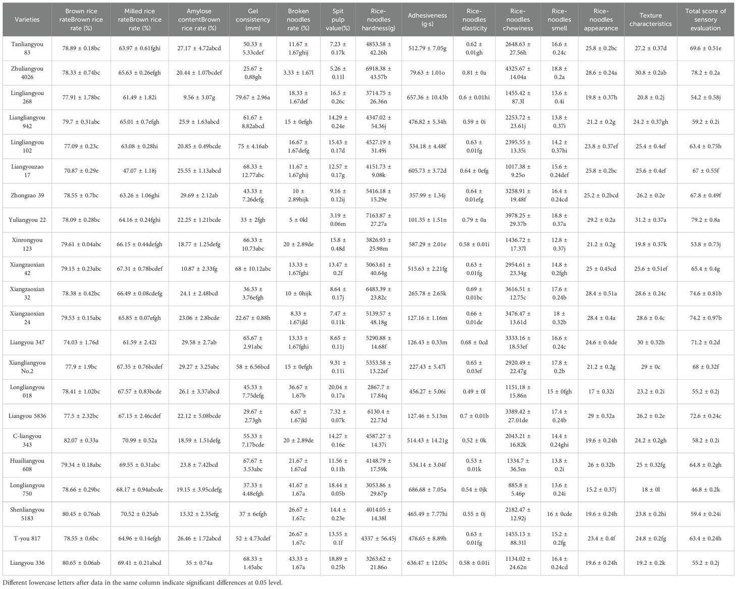 This study primarily investigated the relationship between fresh wet rice noodle quality and the genetic characteristics of raw materials. For instance, different rice varieties vary in amylose and amylopectin content, leading to differences in noodle quality (Huang et al., 2025).Environmental factors significantly affect rice quality. High temperatures, low temperatures, insufficient or excessive light, and improper water management can alter key quality traits such as amylose content, protein content, and gel consistency (Wang et al., 2024; Zhang et al., 2025). Such variability may contribute to the difficulty in establishing uniform screening standards for rice noodle raw materials. Optimized agronomic practices can help stabilize rice quality traits, thereby mitigating the negative effects of this variability. For example, Li et al. demonstrated that improved nitrogen management increases amylose content, reduces chalkiness, and enhances the appearance quality of rice. Similarly (Li et al., 2019). Liu et al. found that controlled drainage before harvest significantly improved milling and appearance quality, as well as gel consistency and RVA profile characteristics (Liu et al., 2023). A limitation of this study is the insufficient exploration of genotype-by-management interactions. Therefore, future research should further examine the interplay between agronomic practices and genetic factors. Stabilizing rice quality performance will enhance the accuracy of screening standards for high-quality fresh wet rice noodle.