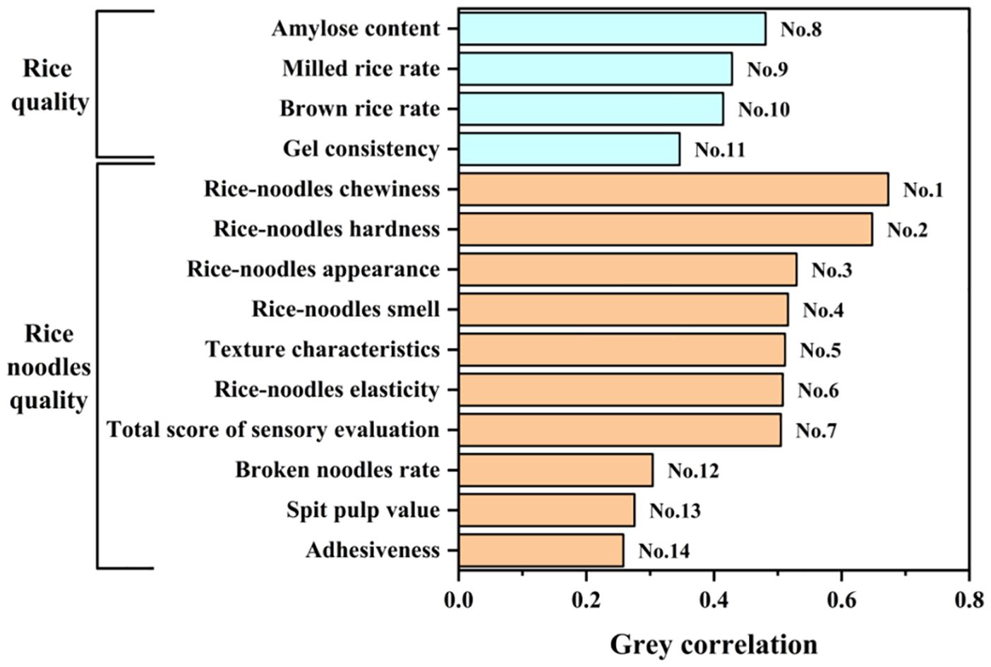 Gray correlation analysis showed that among the 14 indexes, rice-noodles chewiness had the highest correlation with the comprehensive evaluation D-value of 0.66635. However, adhesiveness had the lowest correlation with the comprehensive evaluation D-value of 0.26185 (Equations 5, 6). There is a large gray correlation gap between the individual indexes and the comprehensive evaluation D-value. The quality index of fresh wet rice noodles that was more closely related to the comprehensive evaluation D-value was chewiness. However, the gray correlation value of amylose with the comprehensive evaluation D-value was greater than other rice quality indexes at 0.49441 (Figure 3).