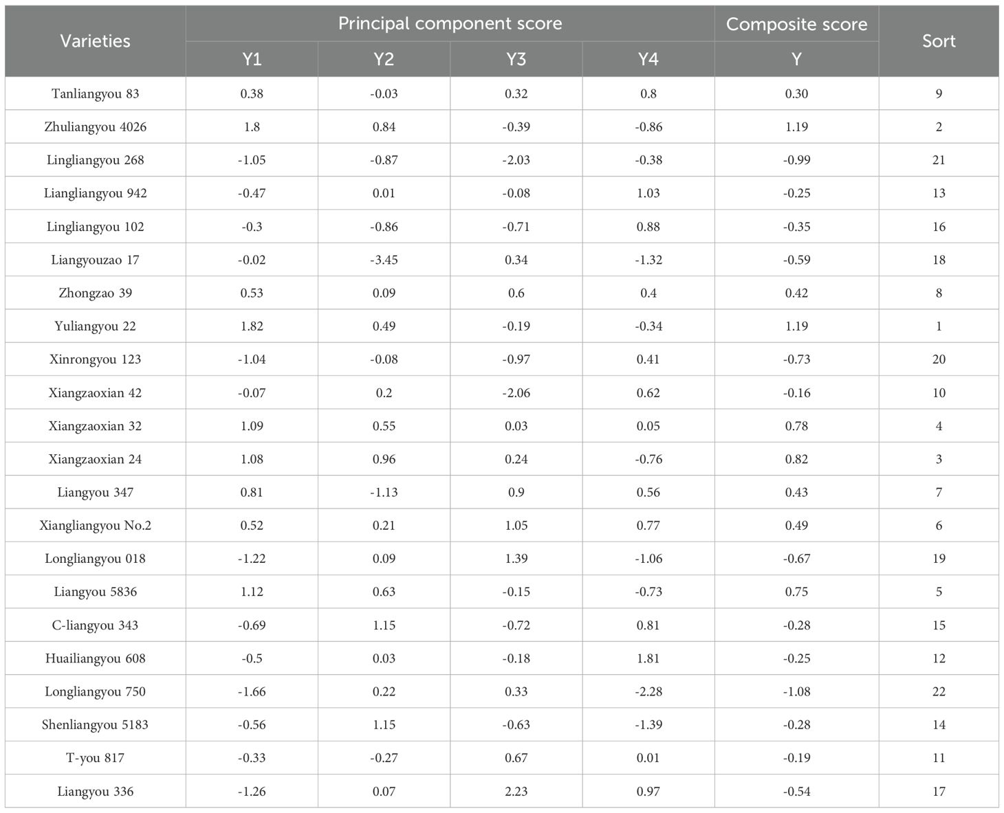 The linear model of four principal components with 14 indices was built from (Equation 1) Table 5. Taking the variance contributions of the above selected principal components 1 to 4 as weights, the principal component composite model could be calculated (Equations 2, 3). Table 7 shows the principal component scores calculated from the principal component equations and the composite scores calculated using the ratio of the variance contribution of each principal component to the total variance contribution of the four principal components as weights. The higher scores for principal component Y1 were obtained for Zhuliangyou 4026, Yu liangyou 22, Xiangzaoxian 32, and Xiangzaoxian 24. This means that these four varieties performed better than the other eighteen varieties in terms of fresh wet rice noodle cooking quality, texture determination, and sensory evaluation. Thirteen varieties—Lingliangyou 268, Lingliangyou 942, Lingliangyou 102, Liangyouzao 17, Xinrongyou 123, Xiangzaoxian 42, Longliangyou 018, C-liangyou 343, Huailiangyou 608, Longliangyou 750, Shenliangyou 5183, T-liangyou 817, and Liangyou 336—scored negative values for principal component Y1. This shows that these thirteen varieties performed poorly for all fresh wet rice noodle indices. For principal component Y2, higher scores were obtained for C-liangyou 343 and Shenliangyou 5183. This means that these two varieties performed better than the other twenty varieties in terms of rice appearance. Seven varieties, namely, Tanliangyou 83, Lingliangyou 268, Lingliangyou 102, Liangyouzao 17, Xinrongyou 123, Liangyou 347, and T-liangyou 817, scored negative values for principal component Y2. This shows that these seven varieties performed poorly for the index of rice appearance. For principal component Y3, higher scores were obtained for Xiangliangyou No.2, Longliangyou 018, and Liangyou 336. This means that these three varieties performed better than the other nineteen varieties in terms of amylose content. Eleven varieties, Zhuliangyou 4026, Lingliangyou 268, Lingliangyou 942, Lingliangyou 102, Yuliangyou 22, Xinrongyou 123, Xiangzaoxian 42, Liangyou 5836, C-liangyou 343, Huailiangyou 608, and Shenliangyou 5183, scored negative values for principal component Y3. This shows that these eleven varieties performed poorly for the index of amylose content. For principal component Y4, higher scores were obtained for Lingliangyou 942 and Huailiangyou 608. This means that these three varieties performed better than the other twenty varieties in terms of gel consistency. Nine varieties, i.e., Zhuliangyou 4026, Lingliangyou 268, Liangyouzao 17, Yuliangyou 22, Xiangzaoxian 24, Longliangyou 018, Liangyou 5836, Longliangyou 750, and Shenliangyou 5183, scored negative values for principal component Y4. This shows that these nine varieties performed poorly for the index of gel consistency.