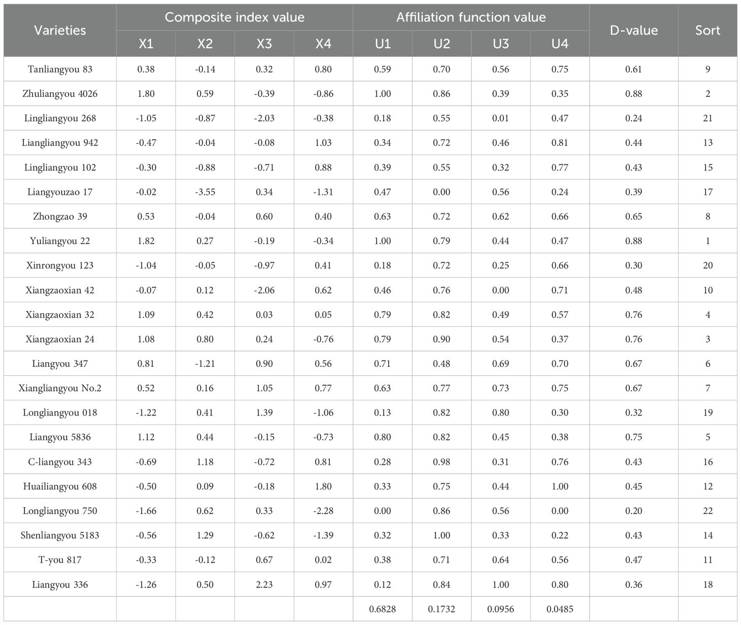 The affiliation function method is an efficient multifactor decision making method to make a comprehensive evaluation of things that are affected by multiple factors. By using the value of the affiliation function of each individual in each principal component and the ratio of the contribution of each principal component factor to the total contribution can calculate the D value of different individuals’ comprehensive evaluation index. The D-value can provide a more intuitive and convenient standard for judging the superior individuals selection. For example, by principal component analysis and affiliation function method, the rice quality of different rice varieties under different N treatments was comprehensively evaluated. Higher overall quality of rice varieties were selected (Ding et al., 2023). Using affiliation function analysis, JM418, HM19, SM22, H4399, HG35 and GY2018 were selected to have excellent drought tolerance. They can be used to research the wheat drought tolerance mechanism and breed the drought-tolerant wheat varieties (Bao et al., 2023). D-value was introduced to evaluate the low nitrogen tolerance and screened SY42, GEMS42-I and GEMS846-II. These three materials grew better and accumulated higher nitrogen under low nitrogen conditions (Miao et al., 2022). In this study, 22 rice varieties were comprehensively evaluated for rice quality and fresh wet rice noodles quality by comprehensive D-value. The results showed that fewer of the twenty-two rice varieties were evaluated with high D-values. However, most of the D-value were intermediate. This means that fewer of the twenty-two rice varieties were suitable as raw material for fresh wet rice noodles. Most of the varieties were intermediate type. Further clustering analysis revealed that twenty-two rice varieties were classified into 4 classes. Among them, Yuliangyou 22 and Zhuliangyou 4026 were in one class. These two varieties had significantly higher D-value than the other varieties.