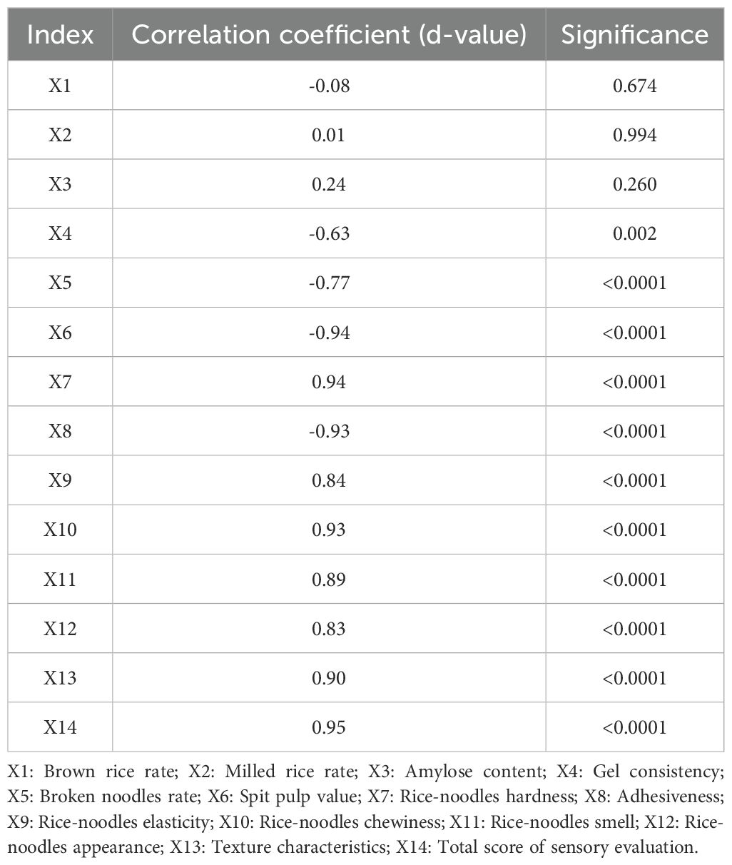Principal component analysis (PCA) reduces multiple correlated indicators into a few independent components and computes scores for each variety, enabling integrated evaluation (Greenacre et al., 2022). In this study, Principal component analysis was used to reduce the 14 indexes to four principal components. Based on the component matrix and principal component contribution ratio, it was further found by computing the total score coefficients of the 14 indexes that gel consistency, broken noodles rate, spit pulp value and adhesiveness played a negative role in the comprehensive evaluation of the fresh wet rice noodles quality. Luo was selected the broken noodles rate, pulp spitting value, iodine blue value and transmittance as the core indicators of the physical and chemical properties of fresh wet Rice noodles in their research results (Luo, 2012). Previous studies have also suggested selecting rice with low gel consistency when selecting raw materials for rice noodles production (Li et al., 2013). However, Jiang et al. pointed out in their research that the smaller the gel consistency, the stronger the strength, the stronger the heat resistance and the faster the gelation speed of Rice noodles gel. If the gel consistency is too small, it is easy to break the strip, and if it is too large, the powder strip is easy to bond and difficult to process (Jiang et al., 2025). Therefore, this also indicates that it is difficult to determine the criteria for the core indicator interval.