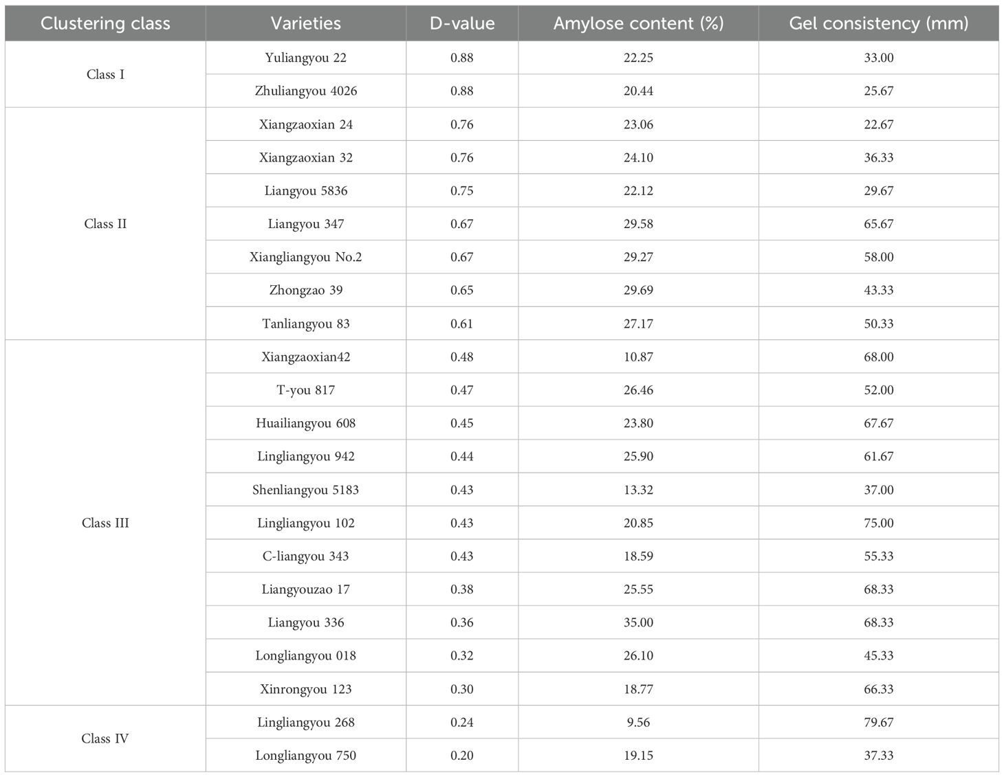 Further 22 rice varieties were classified on the basis of two measures: amylose content between 20-25% and gel consistency less than 40mm. A class of varieties that satisfy a amylose content between 20-24% and gel consistency less than 40mm included Yuliangyou 22, Zhuliangyou 4026, Xiangzaoxian 24, Xiangzaoxian 32, and Liangyou 5836. The second class varieties that only satisfy the amylose content between 20-25% included Huailiangyou 608 and Lingliangyou 102. The three class varieties that only satisfy the gel consistency less than 40mm included Zhongzao 39, Shenliangyou 5183, and Longliangyou 750. The other 12 varieties of Class IV neither satisfied amylose content between 20-24% nor gel consistency less than 40mm.
