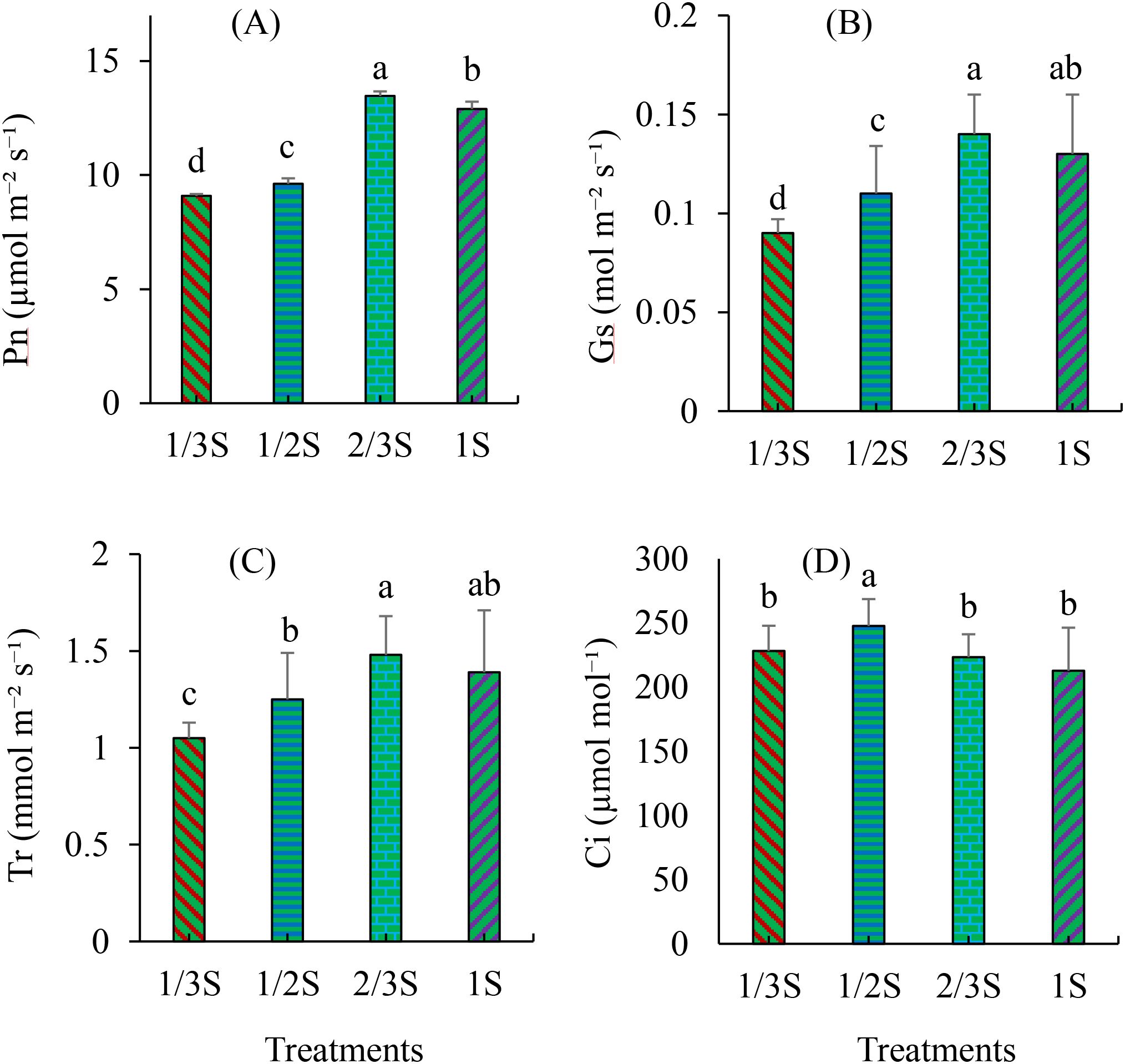 Furthermore, EL, LRWC, and antioxidant enzyme activities such as SOD, CAT, and POD were significantly affected by the treatments (Table 7). In this work, LRWC did not differ significantly among the treatments (Table 7). Regarding EL, the 1/3S and 1/2S treatments showed the highest values, while 2/3S and 1S showed significantly lower values (Table 7). Antioxidant enzyme activities also varied significantly among the treatments. The highest SOD activity was recorded in the 1/2S, 2/3S, and 1S treatments, whereas the lowest was observed in 1/3S (Table 7). In contrast, the 2/3S treatment showed the highest POD and CAT activities, while 1/3S and 1S consistently showed the lowest values for these enzymes (Table 7).