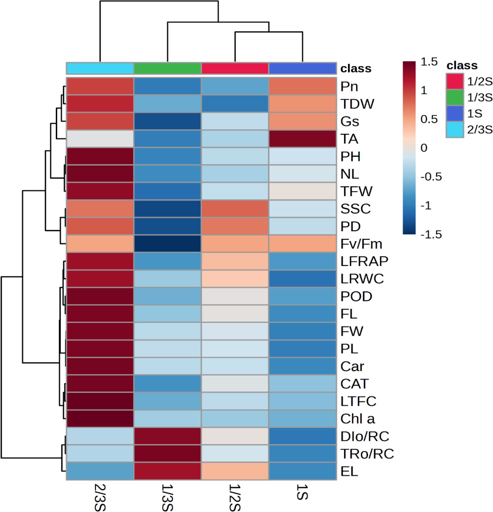 The clustering pattern differentiated treatments based on growth, physiological, biochemical, and fruit traits. Plants grown under the lowest nutrient strength (1/3S) aligned with the stress-related cluster, exhibiting elevated TRo/RC, DIo/RC, and EL, indicating higher physiological stress. In contrast, plants with the full-strength nutrient solution (1S) demonstrated higher titratable acidity (TA) along with moderate values of Pn, Gs, and TDW. The 1/2S treatment was associated with moderate levels of SSC, Fv/Fm, and PD, suggesting intermediate physiological performance. Plants grown under 2/3S were linked to enhanced growth traits (PH, NL, PL, and TFW) and exhibited higher Pn and Gs. This nutrient strength also clustered with most biochemical and pigment-related traits (LTFC, LFRAP, POD, CAT, Car, and Chl a), indicating increased antioxidant capacity and pigment accumulation. Additionally, fruit size traits (FL and FW) were associated with 2/3S, demonstrating that this treatment supported superior fruit development.
