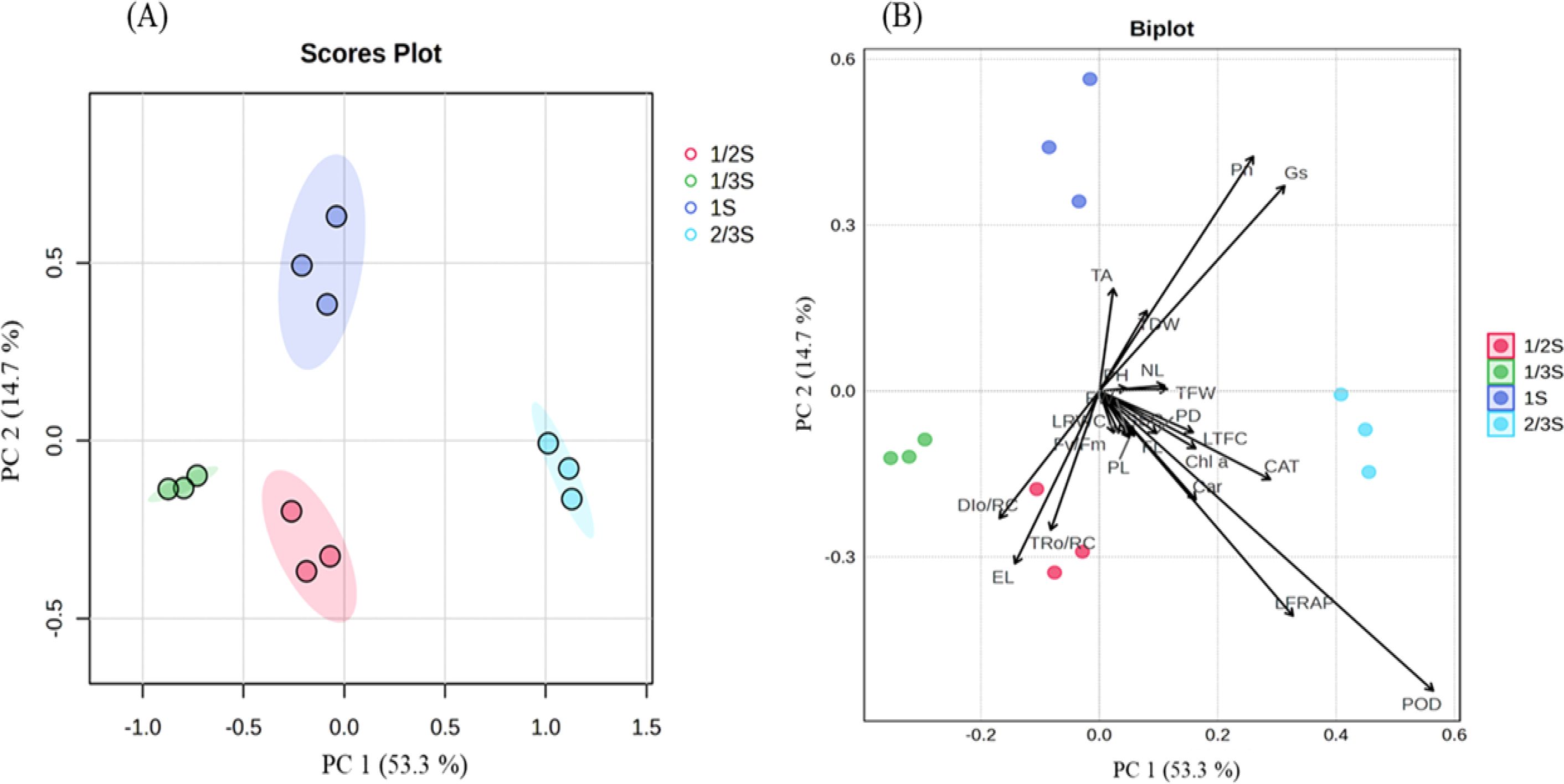 Figure 7. (A) Scores plot showing a distinct separation among the treatments and (B) Biplot illustrating the relationships between treatments and various physiological, biochemical, and morphological traits of strawberry plants. Where; NL, number of leaves; PH, plant height; PL, petiole length; PD, petiole diameter; TFW, total fresh weight; TDW, total dry weight; FL, Fruit length; FW, fruit width; SSC, soluble solid content; TA, titratable acidity; Fv/Fm, ratio of variable to maximum fluorescence; TRo/RC, trapped energy per reaction center; DIo/RC, energy dissipation per reaction center; Pn, photosynthesis rate; Gs, stomata conductance; LRWC, leaf relative water content; EL, electrolyte leakage, Chl.a, chlorophyll a; Car., carotenoids; LTFC, leaf total flavonoid content; LFRAP, leaf ferric reducing antioxidant power; POD; peroxidase, and CAT, catalase.