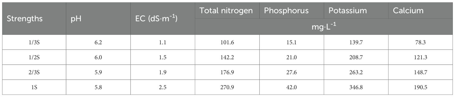 The experiment assessed four strengths of a standardized nutrient solution of the Japan Horticultural Research Institute: one-third strength (1/3S), half strength (1/2S), two-thirds strength (2/3S), and full strength (1S). The experiment was arranged in a randomized complete block design (RCBD) and each replicate includes one slab with 12 plants, and three replicates were used per treatment. The specific content of the full-strength solution is detailed in Table 1. Micronutrient concentrations were supplied at the 1S level across all treatments. During the cultivation period, a recycling hydroponic system was employed to deliver nutrient solutions efficiently and sustainably. The nutrient solution was refilled to its original strength every 10 days, and sometimes it was completely replaced when needed. Electrical conductivity (EC), pH, and concentrations of key ions, including total nitrogen, phosphorus, potassium, and calcium, are shown in Table 2. Irrigation was scheduled daily from 09:00 a.m. to 14:20, with the nutrient solution applied in nine evenly spaced cycles at 40-minute intervals. Under normal weather conditions, each plant received a total of 450 mL of solution per day. On days with low solar radiation or cloud cover, the irrigation volume was adjusted to 250 mL per plant to account for reduced evapotranspiration.
