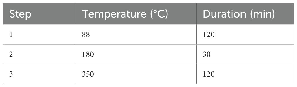 The mineral content of the fruits was analyzed to evaluate the effects of nutrient solution strength on fruit quality, using samples collected in March 2025 (136 DAT). Initially, the samples were freeze-dried until a constant weight was achieved. The dried samples were then ground using a mortar and pestle, and 0.5 g of the resulting powder was mixed with 10 mL of 50% perchloric acid and 1 mL of sulfuric acid. The mixture was thoroughly mixed and left overnight to allow for complete reaction. The following day, the samples underwent sequential heating until the solution became colorless. The heating steps are summarized in Table 3. After digestion, the samples were diluted 200-fold with ultrapure water, filtered using Whatman No. 6 filter paper (pore size 3 μm), followed by syringe filtration (pore size 0.45 μm). An additional 25-fold dilution was performed to match the concentration range of the standards. Mineral analysis was carried out using inductively coupled plasma optical emission spectrometry (Integra Dual, GBC, Australia). The instrument was calibrated with certified standards, and no further chemical treatment was applied prior to analysis. Magnesium, sodium, and potassium standards were purchased from Kanto Chemical Co., Inc. (Nihonbashi Honcho 3-Chome, Chuo-ku, Tokyo, Japan). Calcium and phosphate standards were obtained from Samchun Chemical (Pyeongtaek-si, Gyeonggi-do, Korea) and Supelco (Sigma-Aldrich, Darmstadt, Germany), respectively.