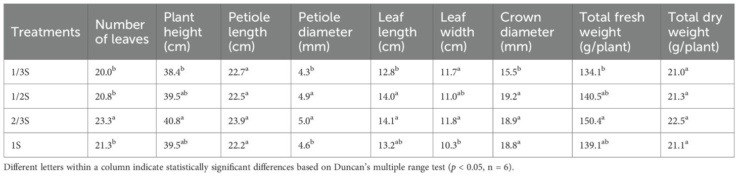 Moreover, nutrient solution strength significantly affected the accumulation of pigments (Figure 3). Chlorophyll a content was highest in the 2/3S treatment, which was statistically similar to the 1/2S treatment but significantly higher than the 1/3S and 1S treatments (Figure 3A). Similarly, chlorophyll b content varied significantly among treatments. The highest levels were observed in the 1/2S and 2/3S treatments, while the lowest were found in the 1/3S and 1S treatments (Figure 3B). Total chlorophyll content was also highest in the 2/3S treatment, which was statistically comparable to 1/2S but significantly higher than both 1/3S and 1S (Figure 3C). Carotenoid content was significantly higher in the 2/3S treatment compared to 1S and 1/3S, but not significantly different from the 1/2S treatment (Figure 3D). The chlorophyll a/b ratio was significantly higher in the 1/3S and 2/3S treatments than in the 1/2S and 1S treatments (Figure 3E). Additionally, the carotenoid-to-total-chlorophyll ratio was significantly higher in the 1/3S treatment compared to the 1/2S and 1S treatments, while the 2/3S treatment showed no significant difference from the others (Figure 3F).