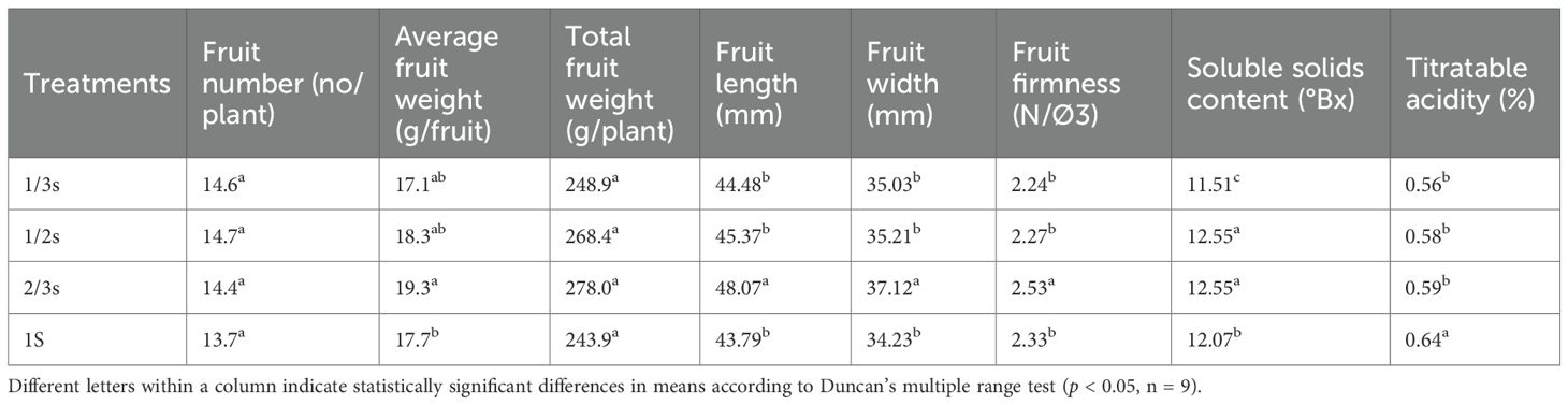 Furthermore, fruit-related parameters were evaluated to assess the effects of varying nutrient solution strengths. The values for these parameters are shown in Table 5. While there was no significant difference in the number of fruits per plant across treatments, numerically, the 1S treatment recorded the lowest fruit count, while the 2/3S treatment had the highest. The average fruit weight per plant was highest under the 2/3S treatment, significantly exceeding that of the 1S treatment. However, the 1/3S and 1/2S treatments did not show significant differences from the 2/3S treatment. Total fruit weight per plant did not differ significantly among treatments; however, a numerical trend was observed in which the lowest values occurred under the 1S treatment and the highest under the 2/3S treatment. Total fruit weight in the 2/3S treatment was 10.5%, 3.5%, and 12.3% higher than in the 1/3S, 1/2S, and 1S treatments, respectively. Moreover, both fruit length and width were significantly higher in the 2/3S treatment compared to the other treatments. Fruit firmness was also significantly higher in the 2/3S treatment than in all other treatments. The soluble solid content (SSC), an important indicator of sweetness, was highest in the 2/3S and 1/2S treatments, while the 1/3S and 1S treatments showed significantly lower values. In contrast, titratable acidity (TA) was significantly higher in the 1S treatment compared to the others.