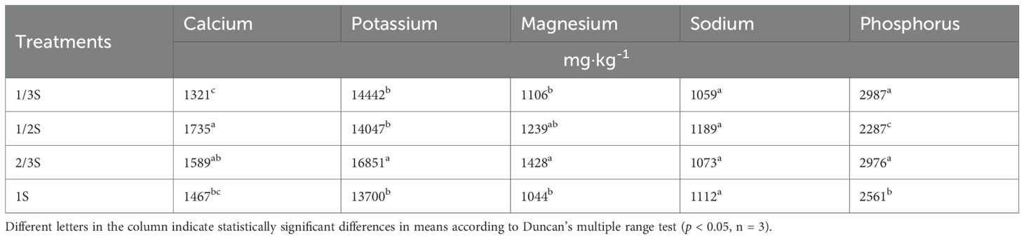 Moreover, the observed variations in fruit mineral content across the different nutrient solution strengths indicate that mineral uptake in strawberries is highly sensitive to nutrient concentration adjustments in the hydroponic system. The lower levels of potassium and magnesium in the 1/3S and 1S treatments suggest that both 1/3S and 1S solutions may hinder optimal uptake of these minerals, which may be due to imbalances in nutrient availability or competition among cations at the root interface. The lowest calcium concentration in the 1/3S treatment further supports the idea that insufficient nutrient supply limits the transport of essential minerals to the fruit. In contrast, the 1/2S treatment resulted in elevated accumulation of calcium and magnesium, while concurrently reducing phosphorus content. This inverse relationship is indicative of nutrient antagonism, wherein increased calcium availability may inhibit phosphorus uptake by competing for root transport mechanisms, as described in Elmendorf and Pierce (1940). Furthermore, Lee J.Y. et al. (2017) reported an antagonistic relationship between these two minerals in Solanum lycopersicum grown under hydroponic conditions. Interestingly, the 2/3S treatment produced a more balanced mineral profile, with improved potassium, magnesium, and phosphorus concentrations, suggesting that moderate nutrient solution strength may optimize mineral uptake efficiency. Such improvements in fruit mineral composition are not only beneficial for plant physiological performance but also enhance the nutritional quality of strawberries, contributing to human dietary mineral intake (Ali, 2023).