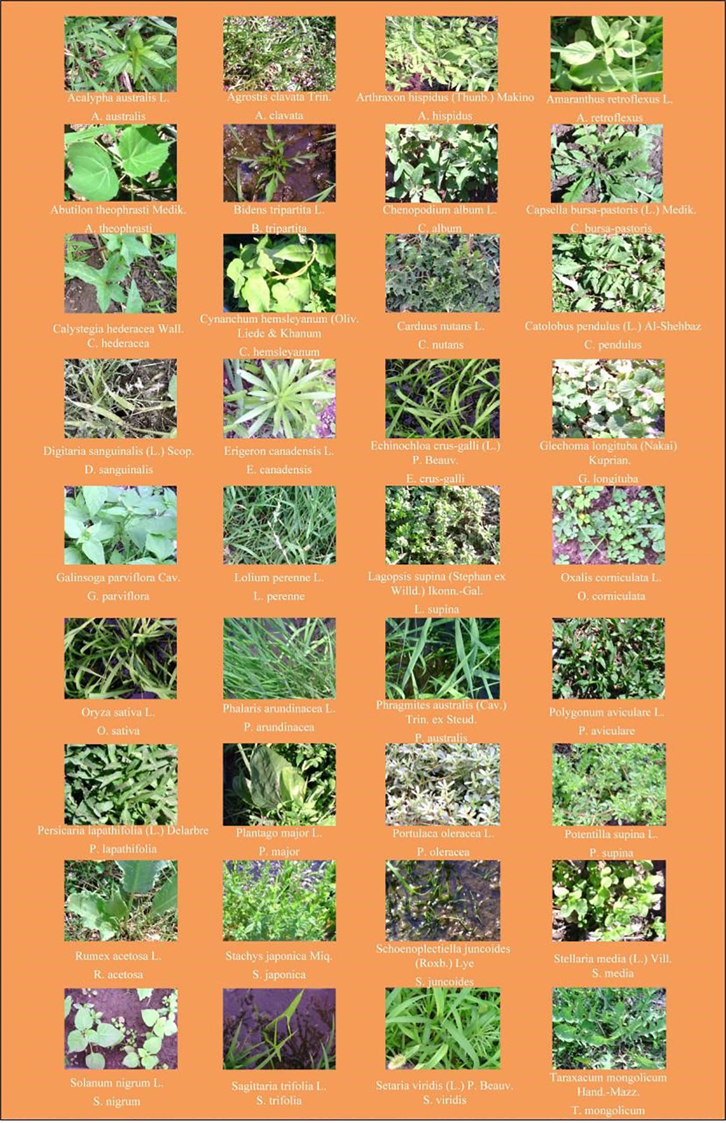 Aromatic rice type 2 (O. sativa) with 13 leaves and 135 days of growth period, which is widely planted in the rice-growing areas of northern China, was selected for this study. The criteria for selecting weed species in paddy fields included but were not limited to factors such as weed species, size, spatial distribution within the field, proximity to field dikes, traffic flow on adjacent agricultural roads, and sample spatial distribution. The chosen weed species were collected from six different locations in the major rice-producing regions of northern China, as depicted in Figure 1. These sampling points encompassed (1) Dandong City (123°37′16.59″N ~ 125°10′24.77″N, 40°44′50.65″E ~ 41°5′12.16″E), (2) Jiaohe City (127°3′30.82″N ~ 128°1′33.04″N, 43°28′44.08″E ~ 44°9′58.18″E), (3) Qitaihe (130°13′22.97″N ~ 131°42′11.23″N, 45°42′41.36″E ~ 46°9′51.20″E), (4) Qiqihar City (123°22′59.83″N ~ 126°14′44.84″N, 46°19′56.73″E ~ 48°10′13.77″E), (5) Shuangyashan City (131°49′28.03″N ~ 134°7′27″N, 45°50′3.93″E ~ 47°28′29.04″E), and (6) Jiamusi City (129°42′51.22″N ~ 134°24′46.84″N, 46°33′5.85″E ~ 48°21′41.30″E). Detailed information regarding the weed species is provided in Figure 2, encompassing a total of 18 families, 35 genera, and 35 species.