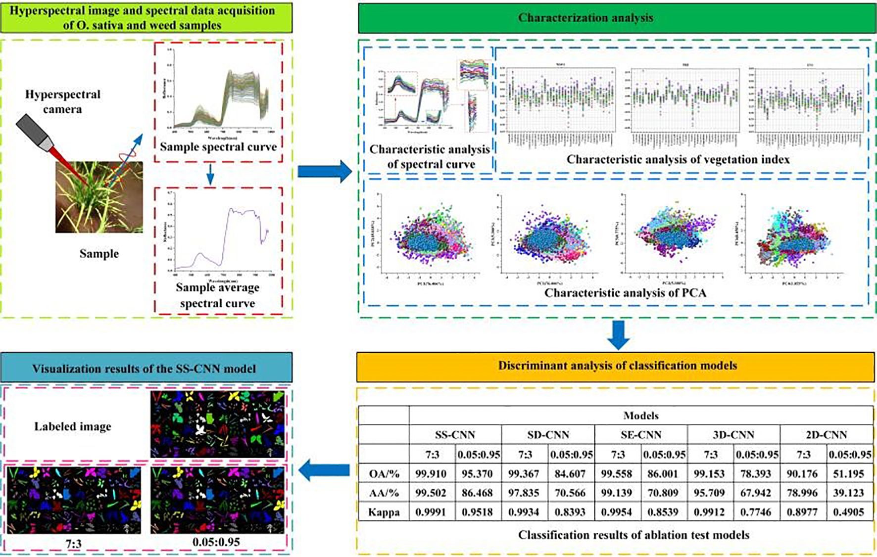 Results: A novel deep learning network, SS-CNN, was developed to identify rice and weed species from hyperspectral imagery, and ablation experiments were conducted to evaluate its performance. When the training sample size (Tr) was set at 70%, the SS-CNN model outperformed the comparative models with the best identification results (overall accuracy (OA): 99.910%, average accuracy (AA): 99.502%, Kappa: 0.9991). Even at a reduced training sample size of 5%, the SS- CNN algorithm maintained optimal classification performance (OA: 95.370%; AA: 86.468%; Kappa: 0.9518).