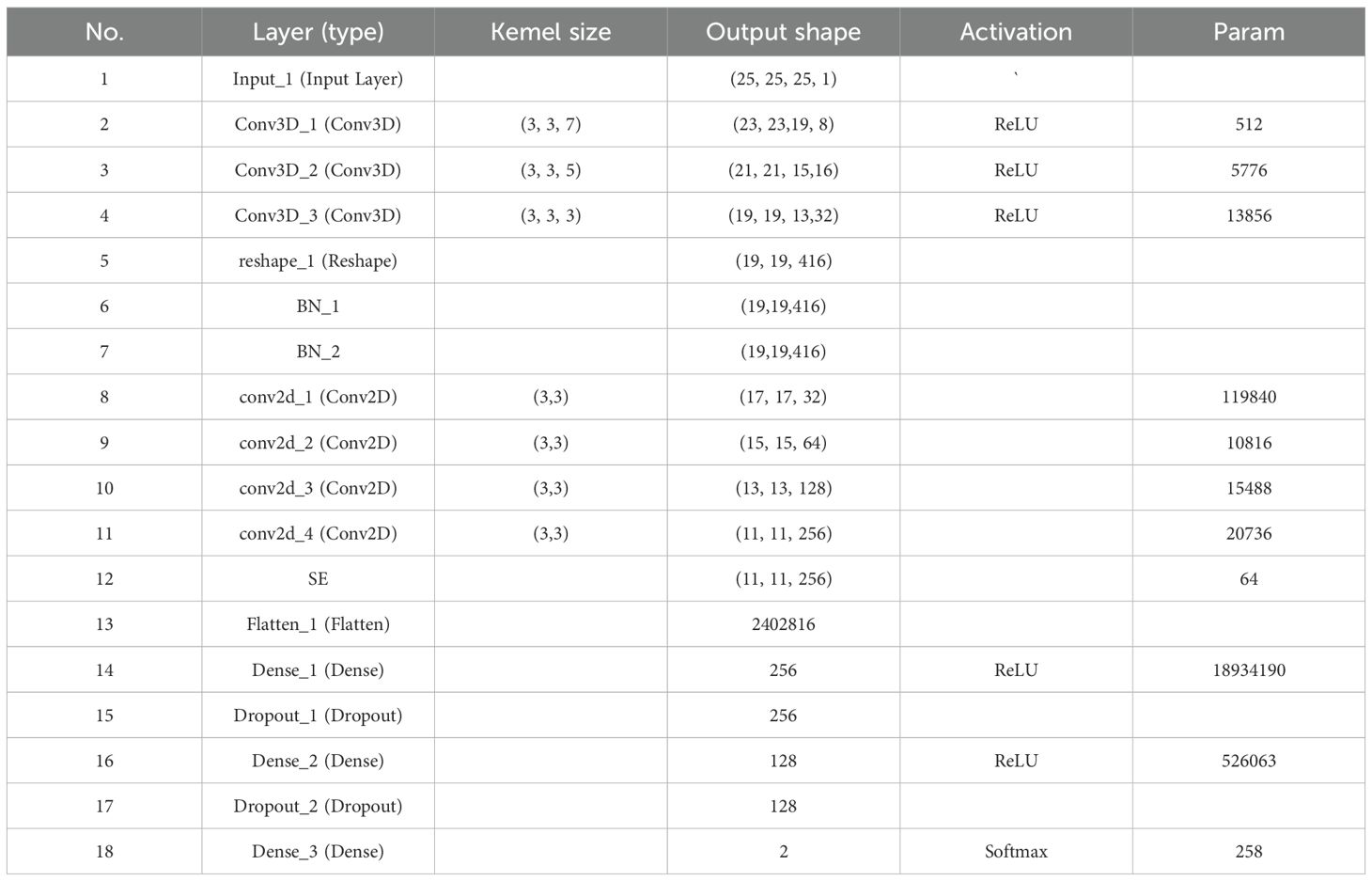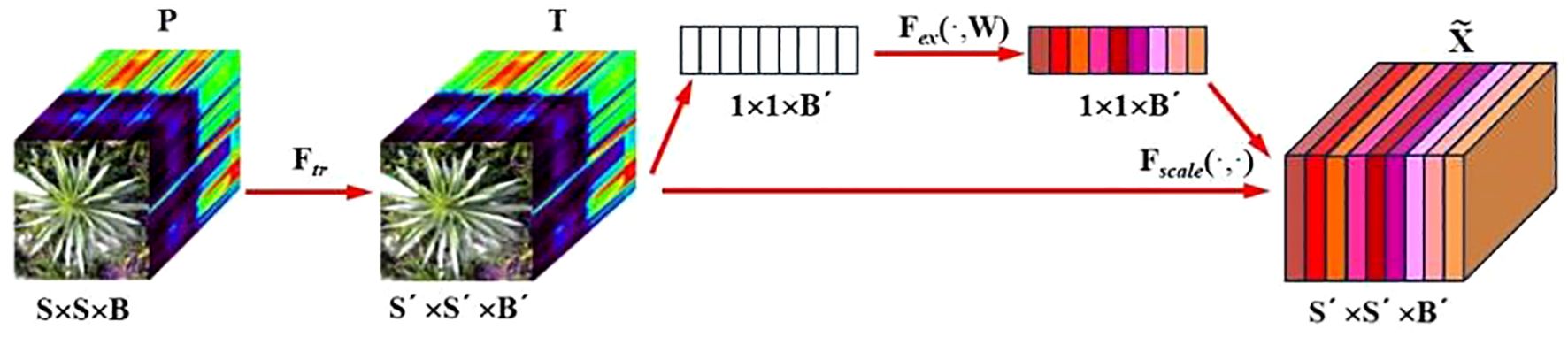 The SE attention module (Squeeze-and-Excitation Networks) proposed by Hu et al (Hu et al., 2020). is introduced after the 3D-2D convolutional layer (Figure 5). Features P extracted by the convolution layers initially undergo a squeeze operation, which aggregates feature maps across the spatial dimensions a×a to generate channel descriptors. These descriptors embed the global distribution of channel feature responses, enabling information from the network’s global receptive field to be utilized by lower layers. Subsequently, an excitation operation follows, in which an auto-gating mechanism based on channel dependencies is employed to learn specific activations for each channel, controlling the excitations for each channel. The feature map P is then reweighted to produce the output of the SE block, which can be directly fed into the subsequent pooling layer.