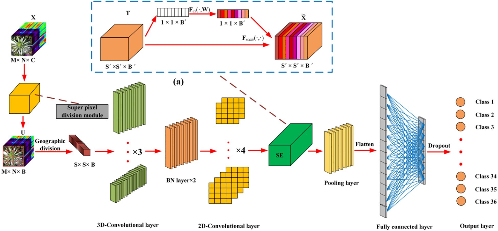 A deep neural network framework was developed for training and validating species-level classification of rice and weed species based on hyperspectral image spatial-spectral features. Neural networks, inspired by the human brain, are a set of algorithms designed for pattern recognition. With the rapid advancement of computer hardware and the proliferation of data, neural networks have proven to be one of the most effective tools for data analysis (He et al., 2015). We established a deep neural network named SS-CNN (Superpixelwise Division-Squeeze-and-Excitation Convolutional Neural Network) for identifying 35 weed species and rice in paddy fields in northern China. The network’s architecture is illustrated in Figure 4. The network takes hyperspectral images as input and the probabilities of rice and weed species as output. It comprises an input layer, a superpixel segmentation module, three 3D convolutional layers (with 8, 16, and 32 neurons, respectively), two Batch Normalization (BN) layers, four 2D convolutional layers (with 32, 64, 128, and 256 neurons, respectively), an SE attention mechanism module, a pooling layer, a flatten layer, two fully connected layers, and an output layer with 36 neurons. The SoftMax function is applied at the output layer to generate probabilities.