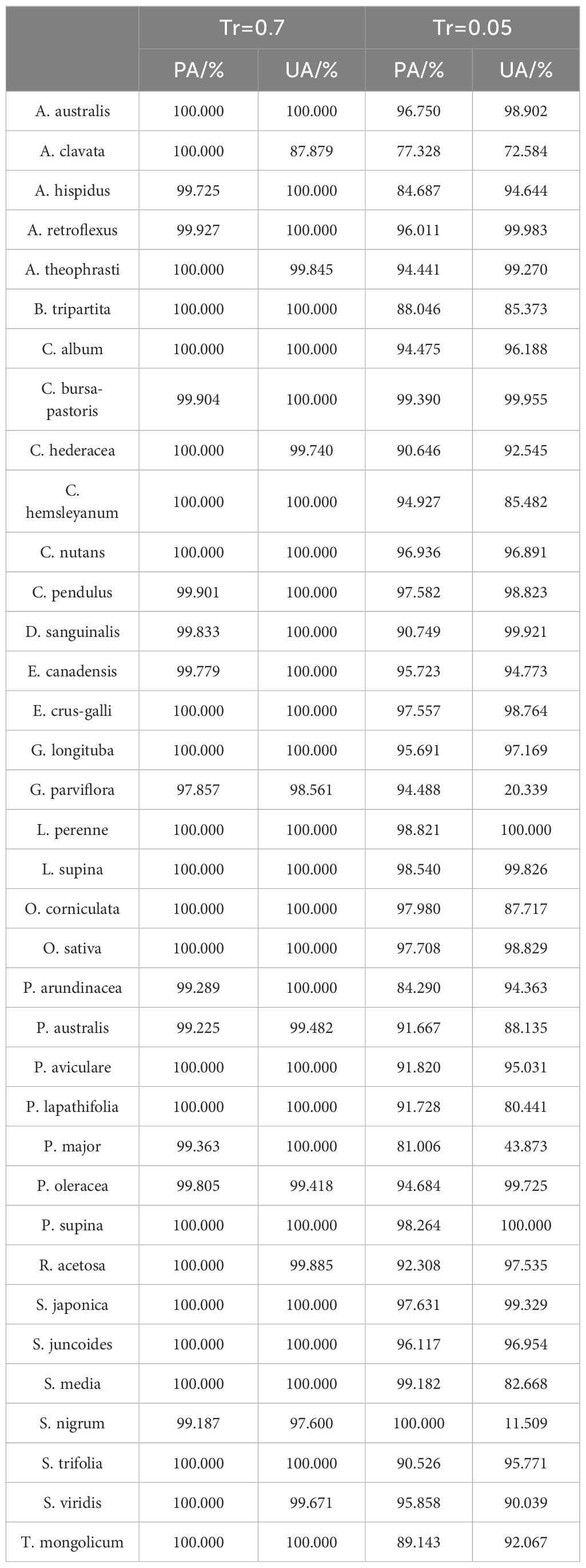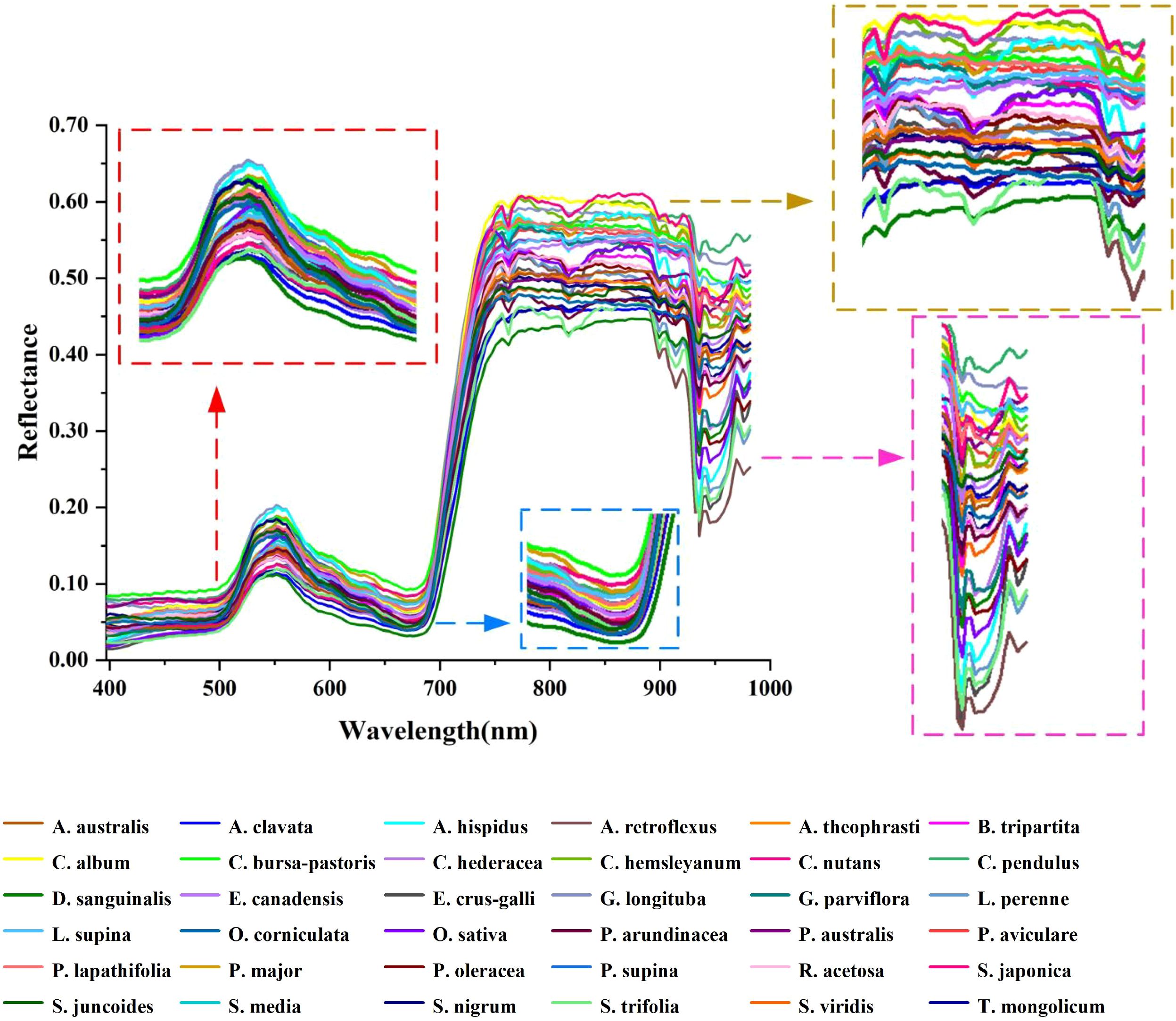Some hyperspectral databases composed of plant-specific information have been established, providing important support for the development of environmental protection, sustainable agriculture, and other fields. Laporte-Fauret et al (Laporte-Fauret et al., 2020). conducted a comprehensive multi-scale survey of coastal dune systems located approximately about 20 km southwest of France, and generated a spectral library of vegetation community ground cover types in dune areas to characterize the spatial distribution of stability patterns in coastal dunes. Prasad et al (Prasad et al., 2015). collected canopy-level field spectra and leaf-level laboratory spectra of 34 species from two different mangrove ecosystems on the eastern coast of India, and the removal of water vapor absorption bands and smoothing of spectra to develop an exclusive spectral library of mangrove species to generate species level mangrove mapping of other regions will be taken up in future studies. Chi et al (Chi et al., 2021). developed a spectral library of 16 common vegetation species and mosses in the Ant-arctic ice-free region using field spectrometers, and analyzed them using spectral dis-crimination measures to observe the spectral characteristics and potential separability of Antarctic plants in different wavelength ranges.Su et al (Su et al., 2022). analyzed (spectrally) and mapped the distribution of triticale weeds in wheat fields by integrating unmanned aerial vehicle (UAV), multispectral imagery, and machine learning techniques. Mkhize et al (Mkhize et al., 2024). recorded 165 GPS points of weed, maize and mixed categories in the early growth stages of six maize farms, these GPS points were superimposed on Sentinel-2 images within two days after obtaining field data to guide the collection of spectral features of maize, mixed and weed categories. Dai et al (Dai et al., 2023). collected 700 sets of spectral data of wheat and weeds, and the classical support vector machine (SVM) based on spectral data was applied to identify weeds to study the classification performance of wheat and weeds in different bands. While existing spectral libraries encompass a broad range of spectral information, they offer limited coverage of spectral characteristics for weed species in agricultural ecosystems, especially in paddy fields. Unique to paddy fields, species such as E.crus-galli and S.trifolia, are unlikely to be found from these spectral libraries. Northern Chinese cold paddy fields are renowned for their high weed species diversity and distinctive agricultural landscape features, with most weed growth occurring in the intense field environment characterized by a network of canals and vast fertile expanses. Therefore, this study takes the rich weed species in paddy fields in northern China as the research object, and pro-vides useful contributions to the development of hyperspectral images and databases to fill the gap in the study of weed stress species in paddy fields in northern China.