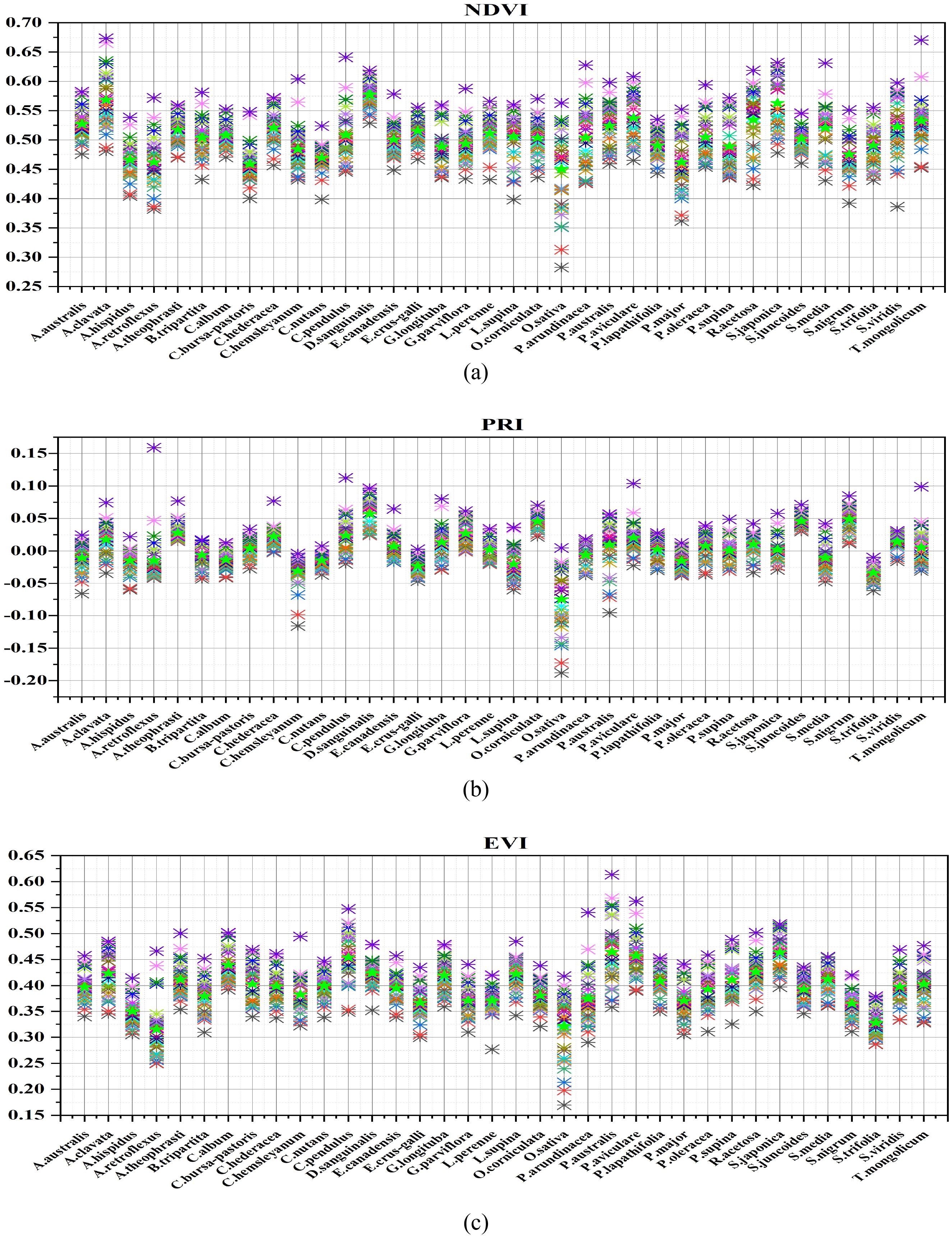 Figure 8. Vegetation index distribution map of rice weed samples (a NDVI, b PRI, c EVI), ★ represents the average value of vegetation index for each sample, ✱ represents the average vegetation index value of the sample on each hyperspectral image of a species (each hyperspectral image is represented by different colors).