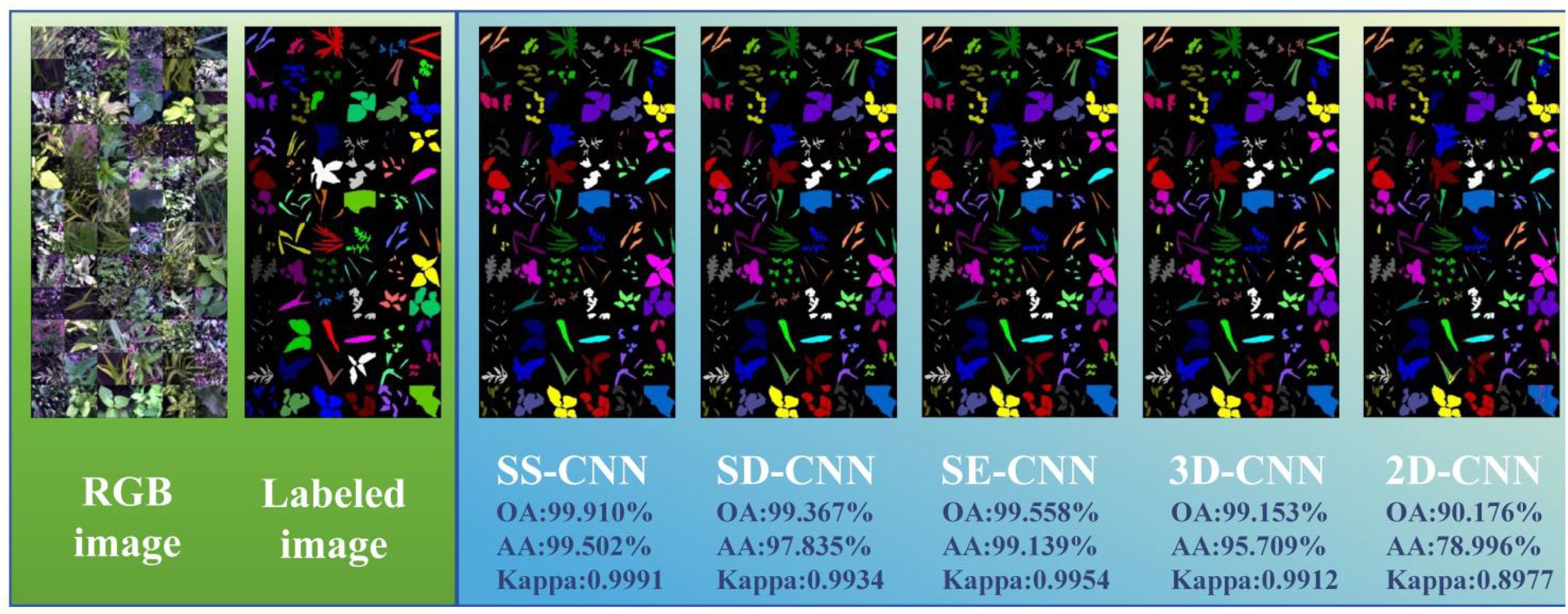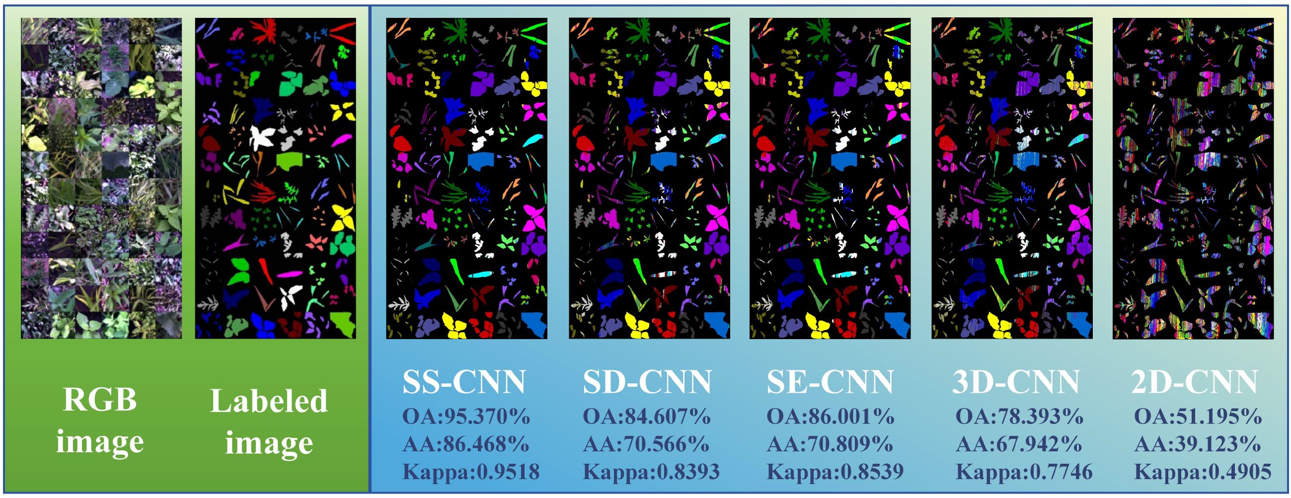 The visualization results at Tr = 0.05 show the change of classification results of deep neural networks under different modeling strategies. Both 3D-CNN and 2D-CNN algorithms exhibit issues related to misclassification among diverse weed species. This phenomenon can be attributed not only to the limited global information comprehension of the entire image by the 3D-CNN and 2D-CNN algorithms but also to the challenge of these models in learning and capturing the underlying non-linear relationships within the rice and weed sample data as the labeled samples decrease. Similarly, consistent with the modeling strategy of Tr =0.7, in the case of Tr =0.05, the classification algorithm (SS-CNN, SD-CNN, SE-CNN) optimized by the superpixelwise division module and the SE attention mechanism module is superior to the detection effect of 3D-CNN and 2D-CNN. Notably, the SS-CNN algorithm proposed in this study achieved a classification accuracy of 95.370%, with recognition performance highly consistent with labeled images.