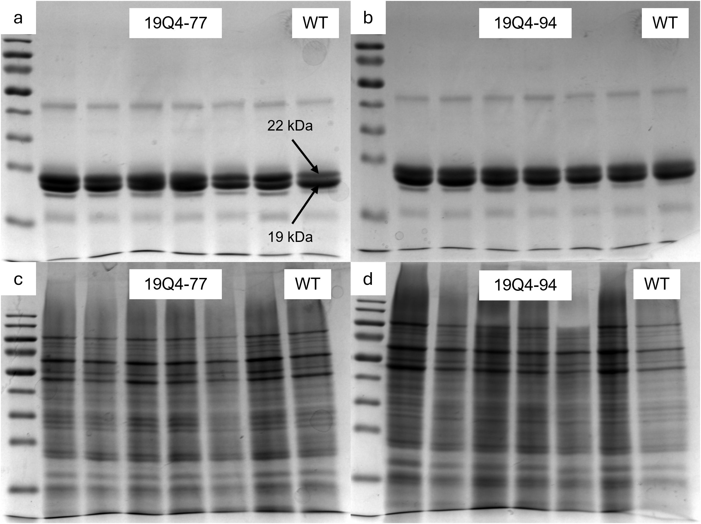 To separate kafirins and non-kafirins for comparison across edited and unedited lines, pools of each fraction were analyzed using SDS–PAGE. Kafirin (Figures 3a, b) and non-kafirin (Figures 3c, d) fractions were prepared from 19Q4–77 wx and 19Q4–94 Wx derived from single-plant pools of seeds. The wild-type kafirin and non-kafirin fraction composition was characterized by pooling three kafirin/non-kafirin extractions from three pools of seeds from single-plant RTx430 plants. Based on the magnitude of protein resolution at 22 kDa, kafirin proteins had similar abundances in edited lines 19Q4–77 wx and 19Q4–94 Wx compared to unedited wild-type RTx430 (Figures 1b, 3a). Non-kafirin abundance based on protein resolution excluding 22 kDa between 19Q4–77 wx and wild type (Figure 3c) is similar, with little evidence of an increase in non-kafirin protein abundance in 19Q4–94 Wx (Figures 3c, d). The presence of the waxy mutation did not obviously affect kafirin and non-kafirin abundance.