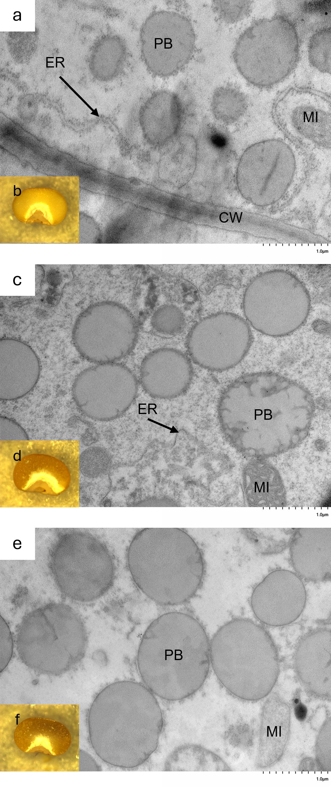 Figure 4. Morphology of endosperm’s third cell layer from aleurone layer of (a) 19Q4–77 wx, (c) 19Q4–94 Wx, and (e) RTx430 by transmission electron microscopy and dissecting microscope image of basal half of 19Q4–77 wx (b), 19Q4–94 Wx (d), and RTx430 (f) seed representative of endosperm texture. PB, protein body; ER, rough endoplasmic reticulum; MI, mitochondria; CW, cell wall.